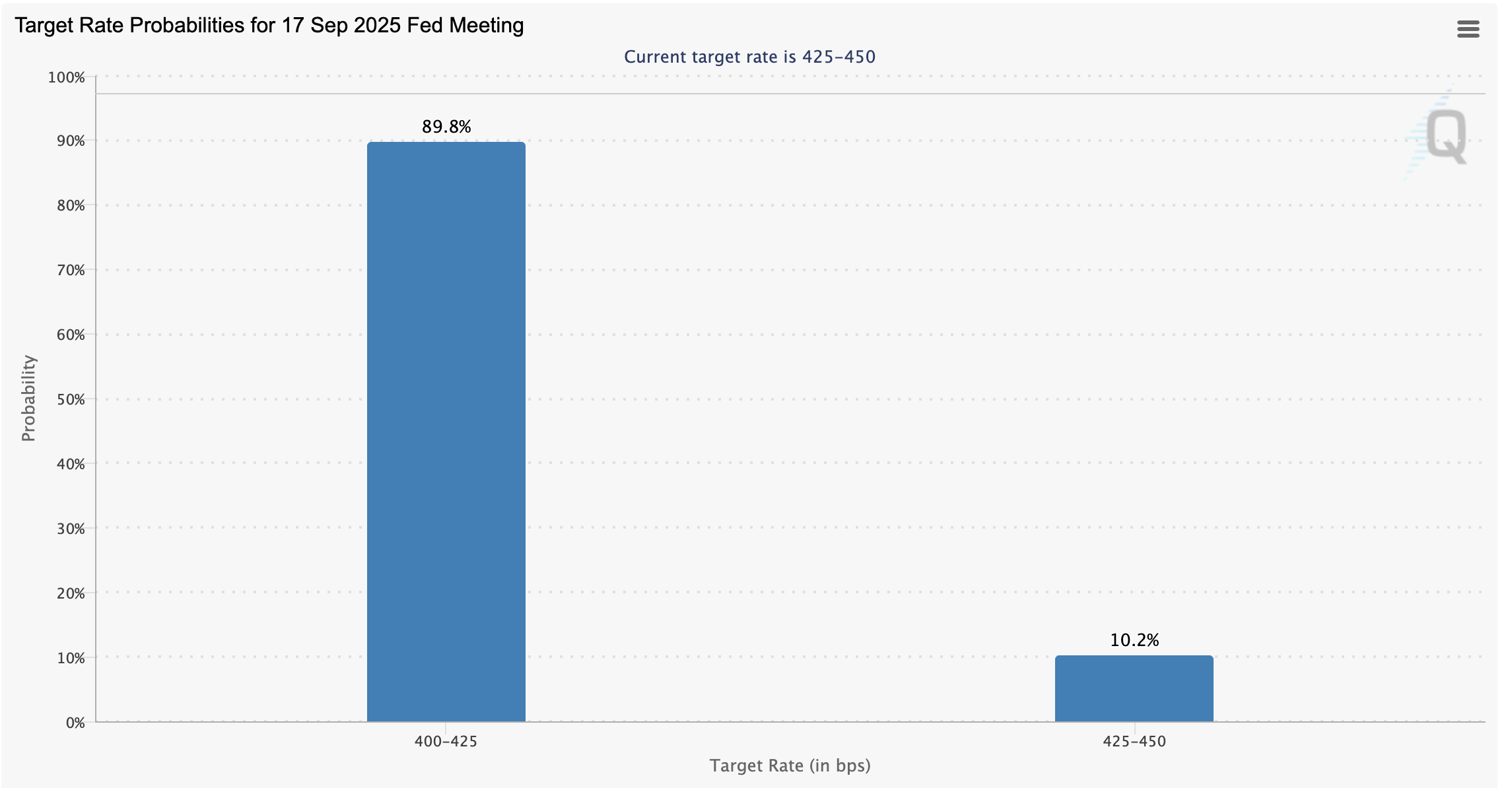Según la herramienta CME Fedwatch, hay un 89.8% de probabilidad de que la Reserva Federal recorte las tasas de interés en 25 puntos básicos (pb) a un rango de 4% a 4.25%, un posible salvavidas para clases de activos de riesgo, como las criptomonedas y las acciones.