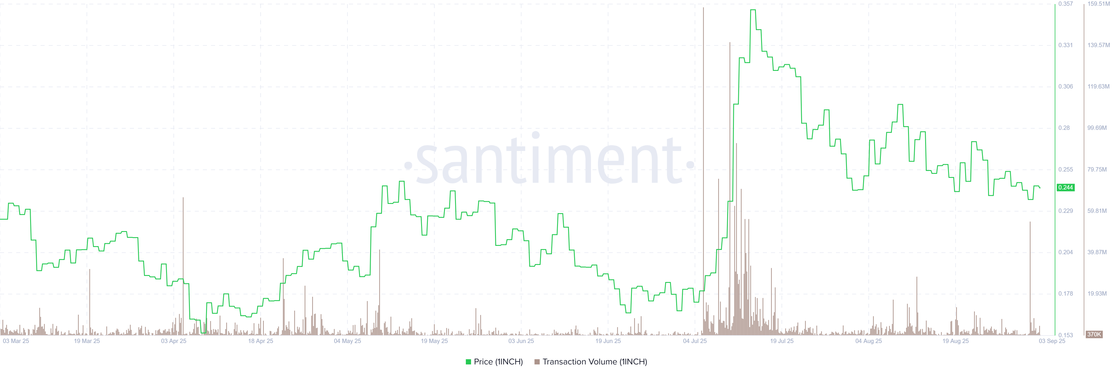 Gráfico de volumen de transacciones diarias de 1inch. Fuente: Santiment