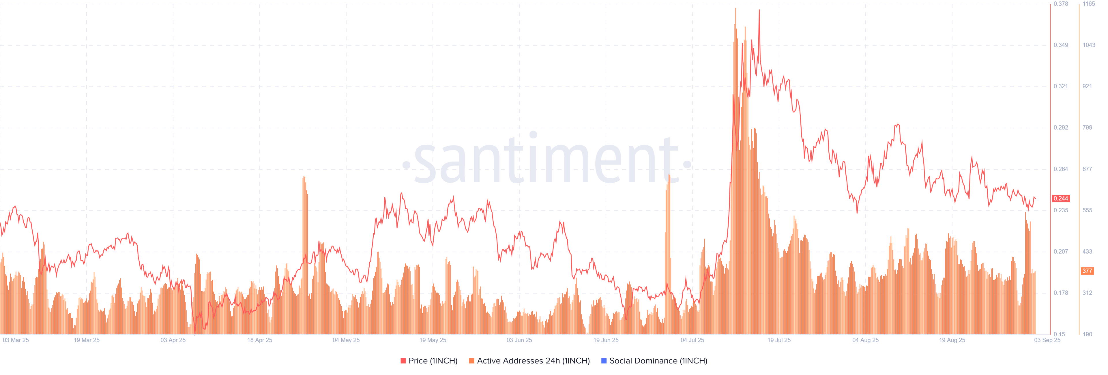 Gráfico de direcciones activas diarias de 1inch. Fuente: Santiment