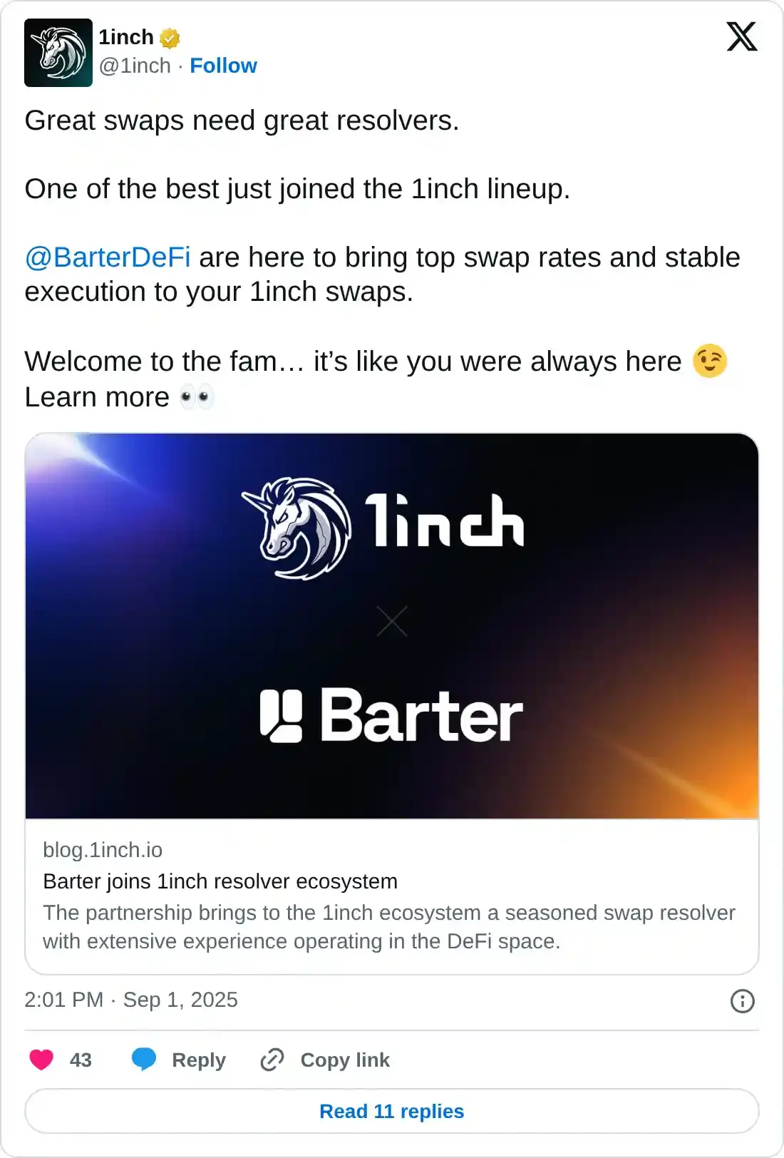 Además, el lunes, 1inch anunció una asociación con Barter, trayendo un experimentado resolutor de intercambios al espacio DeFi. Esta asociación permite a los usuarios ejecutar intercambios basados en intenciones, ofreciendo operaciones más eficientes y rentables.