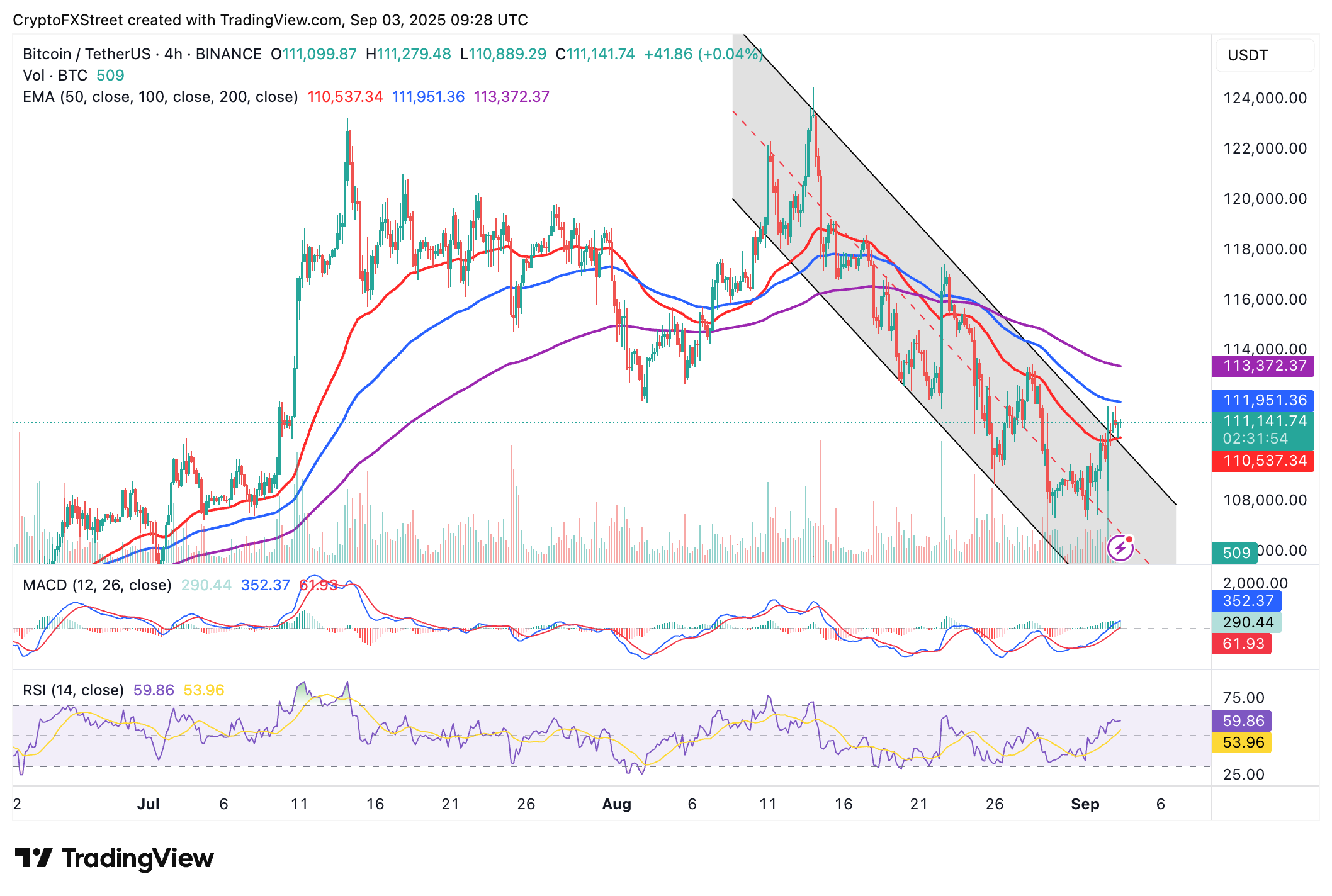 El precio del Bitcoin se mantiene por encima de los 111.000$ después de romper el canal descendente en el gráfico de 4 horas. La Media Móvil Exponencial (EMA) de 50 períodos en 110.537$ proporciona soporte inmediato, ya que las caídas por debajo del soporte de número redondo de 110.000$ podrían acelerarse hacia la próxima zona de demanda en 107.271$, que fue probada el lunes y a principios de julio.