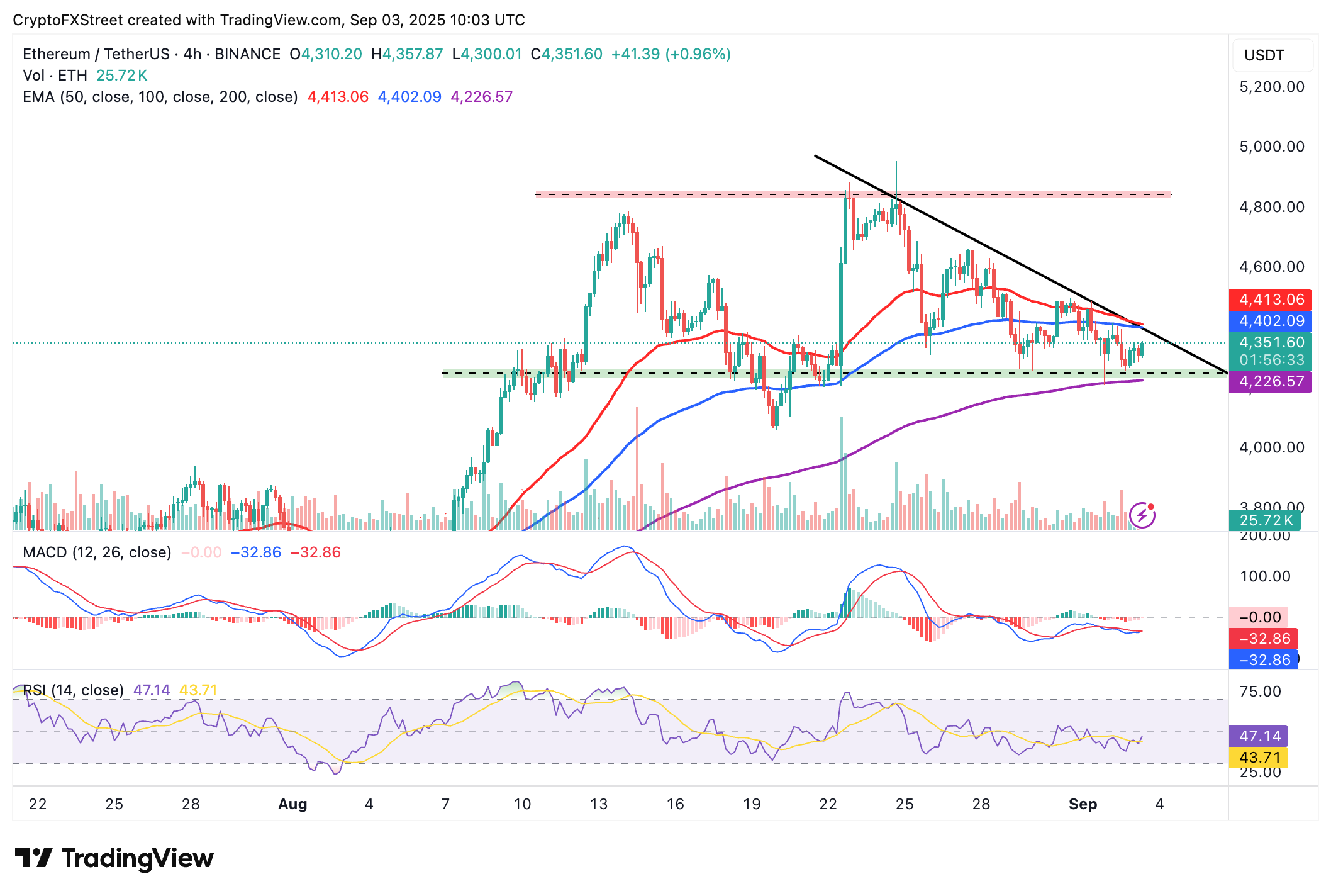 El precio de Ethereum se mantiene por encima de los 4.300$, respaldado por una estructura técnica en fortalecimiento. Un breakout por encima del siguiente nivel de resistencia clave en 4.402$, como lo indica la EMA de 100 períodos en el gráfico de 4 horas, afirmaría el control alcista.