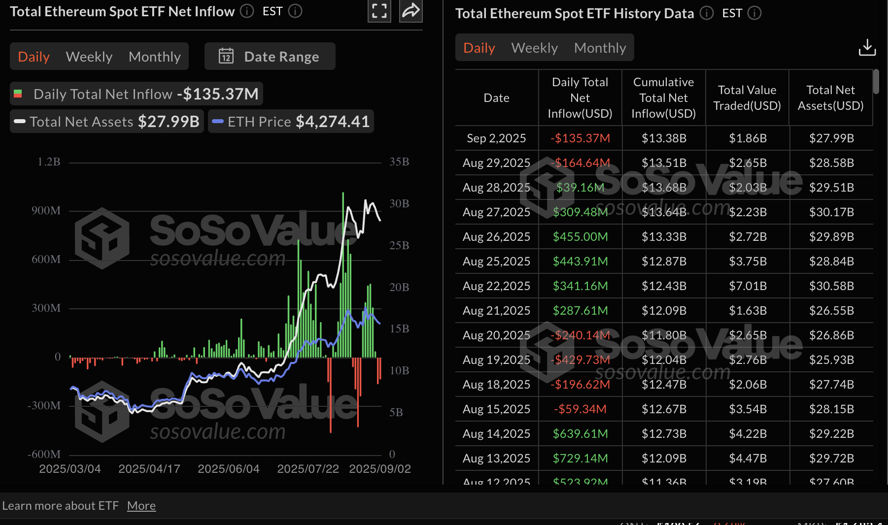 Por otro lado, los ETFs de Ethereum han reanudado las salidas tras seis días de entradas consecutivas. Según los datos de SoSoValue, los ETFs de ETH al contado en EE.UU. experimentaron salidas de 135 millones de dólares el martes, extendiendo la tendencia bajista que comenzó el viernes.