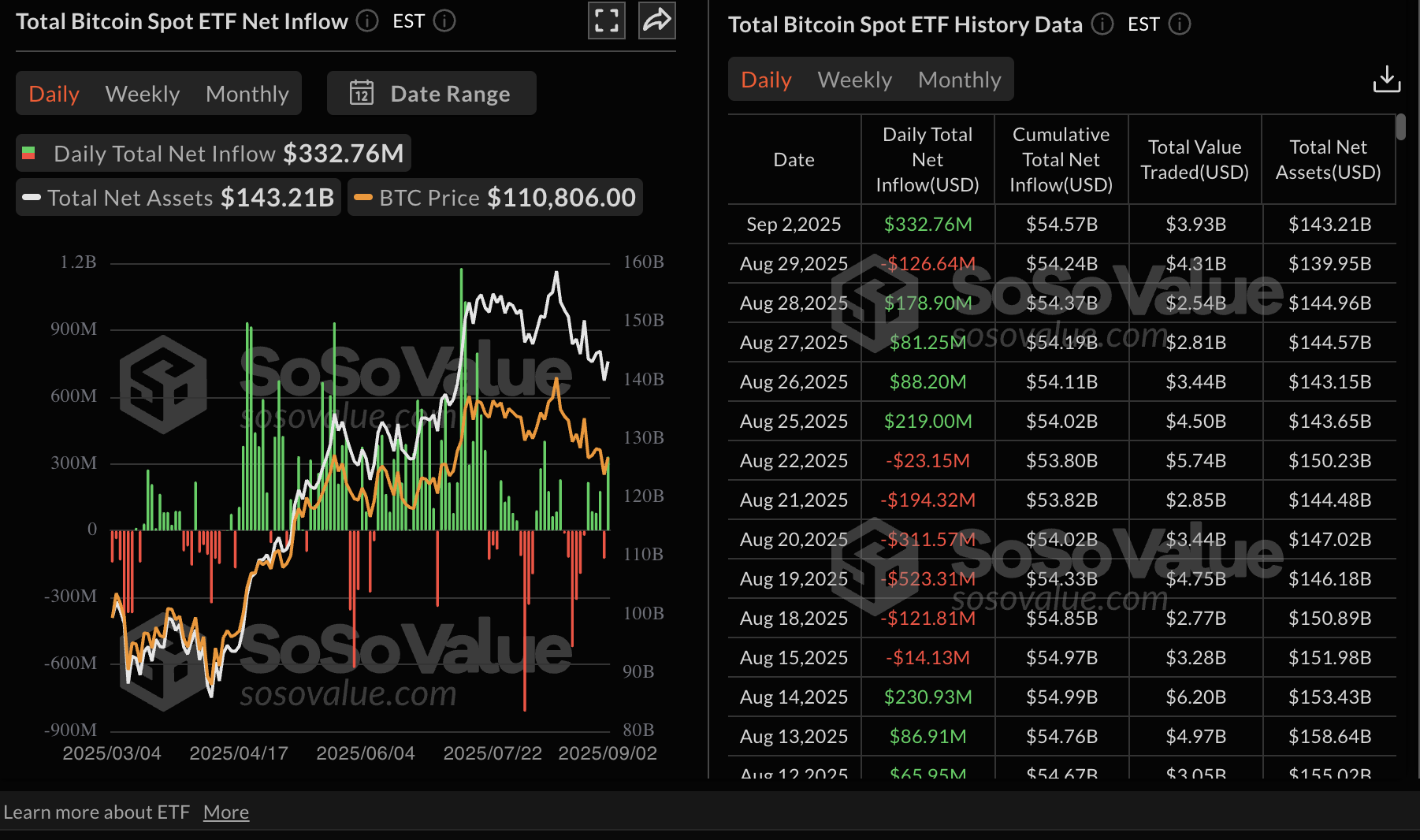 El interés en los Fondos Cotizados en Bolsa (ETFs) de Bitcoin está aumentando, con entradas de 333 millones de dólares registradas el martes. Desde el 25 de agosto, los ETFs de Bitcoin al contado han visto solo un día de salidas, totalizando 127 millones de dólares el 29 de agosto.