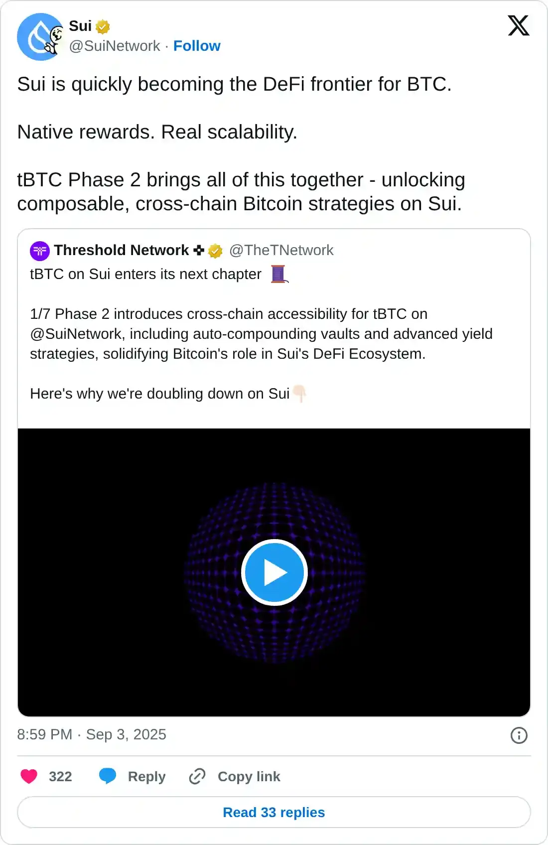 Aparte del aumento de transacciones, las asociaciones en expansión de Sui y los desarrollos en curso también apoyan la visión alcista. Threshold Network ha profundizado su integración de Bitcoin en Sui con el lanzamiento de la Fase 2 de tBTC, tras una fuerte adopción en la Fase 1. En su fase inicial, Bitcoin creció rápidamente para representar el 20% del Valor Total Bloqueado (TVL) de Sui, con 10 millones de dólares en tBTC suministrados en Alphalend y más de 2.8 millones de dólares en liquidez añadida. Ahora, con la Fase 2 en marcha, DeFi de Bitcoin en Sui se está acelerando, preparando el escenario para la próxima ola de adopción y actividad entre cadenas.