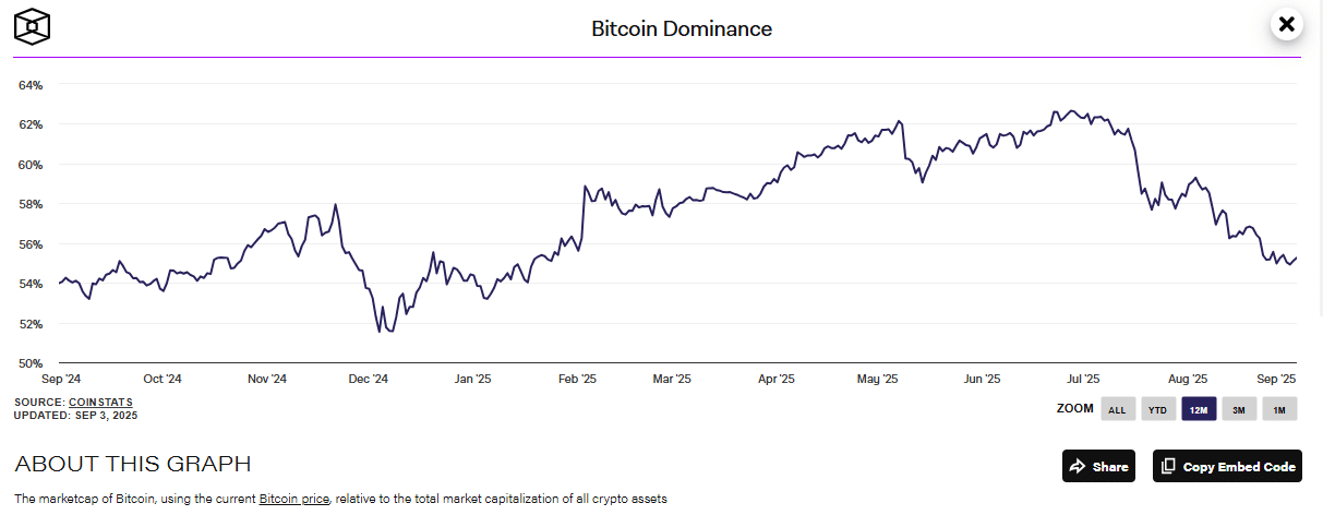 - La dominancia del bitcoin cae del 62 % al 55 %, un umbral crítico para los altcoins.