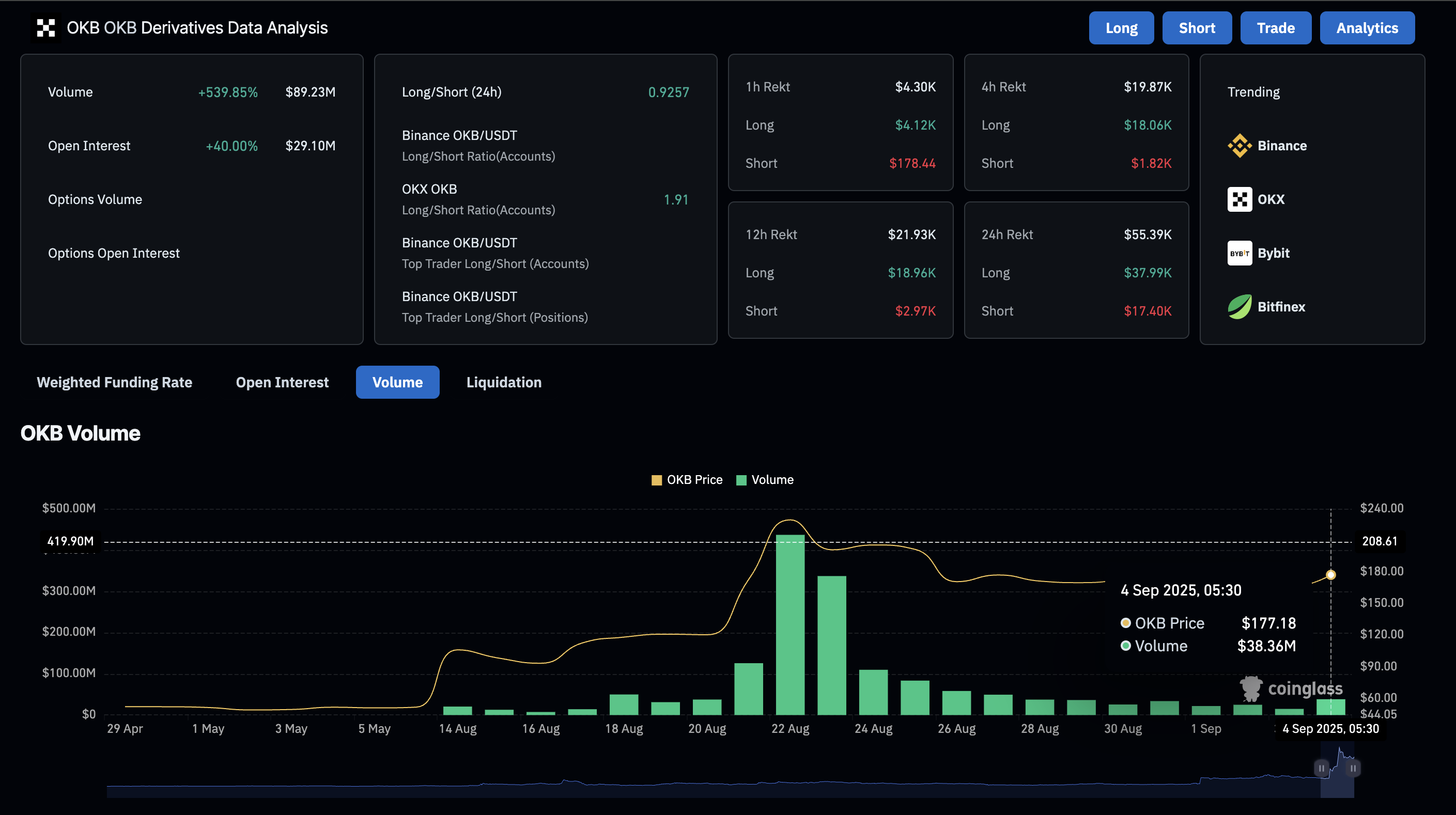 Los datos de CoinGlass muestran que el interés abierto de OKB (OI) ha aumentado un 40% en las últimas 24 horas, alcanzando los 29.10 millones de dólares. El aumento de dos dígitos en el OI refleja un incremento en el flujo de capital a medida que el apetito de riesgo alimenta el interés en OKB entre los operadores.