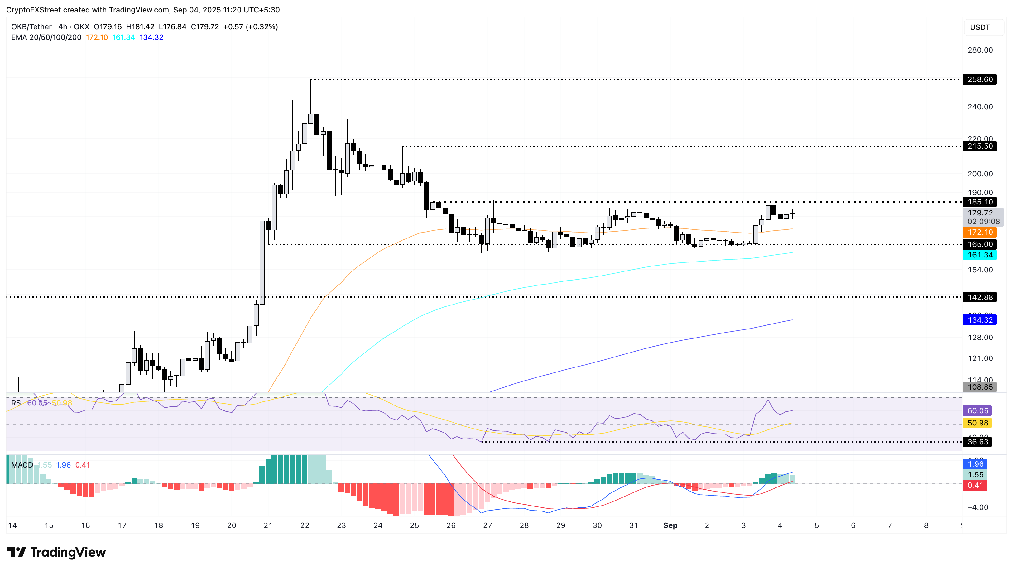 OKB cotiza cerca del límite superior de un rango de consolidación formado entre 185$ y 165$ en el gráfico de 4 horas. El rebote desde la línea base de 165$ se mantiene por encima de la media móvil exponencial (EMA) de 50 periodos en 172$.