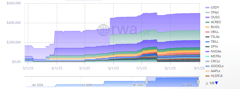 Más allá de las stablecoins, los tokens respaldados por deuda del Tesoro de EE.UU. suman alrededor de 304.6 millones de dólares. En particular, los productos USDY y OUSG de Ondo Finance representan 249.4 millones de ese total.