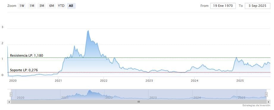 Por el lado positivo, una ruptura por encima de 0.84 dólares permitirá a los compradores apuntar al nivel psicológico de 1 y 1.24 dólares. El máximo histórico está en 3.10 dólares.
