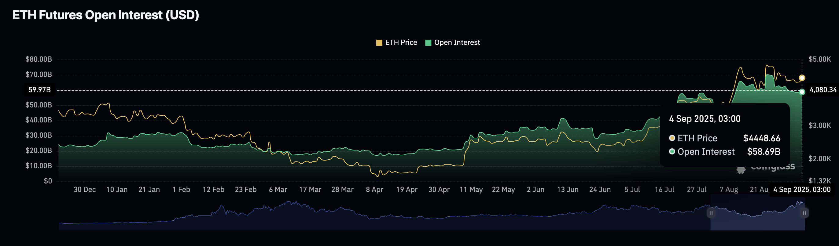 Ethereum, por otro lado, enfrenta una disminución significativa en el interés abierto de futuros (OI), que, según los datos de CoinGlass, se sitúa en 59.000 millones de dólares después de alcanzar un máximo histórico de 70.000 millones de dólares el 24 de agosto.