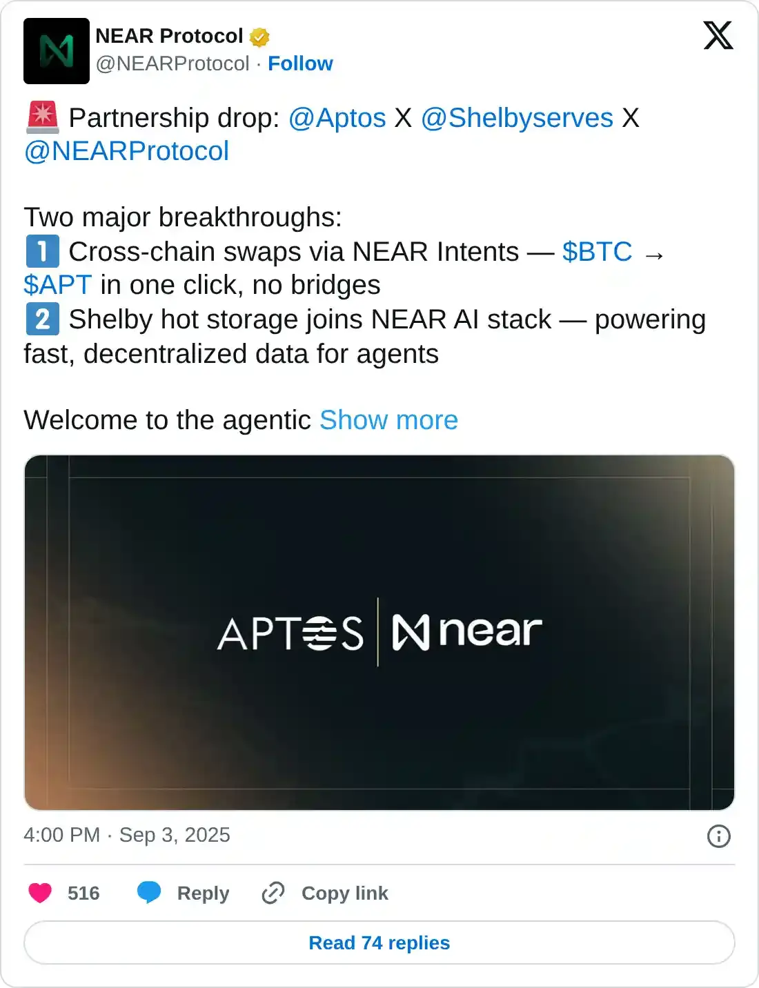 Near Protocol y Aptos (APT) han firmado un acuerdo de asociación, que verá a las dos redes de criptomonedas colaborar en intercambios entre cadenas. La función se ejecutará a través de Near Intents, un protocolo de código abierto para intercambios entre cadenas y abstracción de cadenas impulsado por la tecnología blockchain de Near.