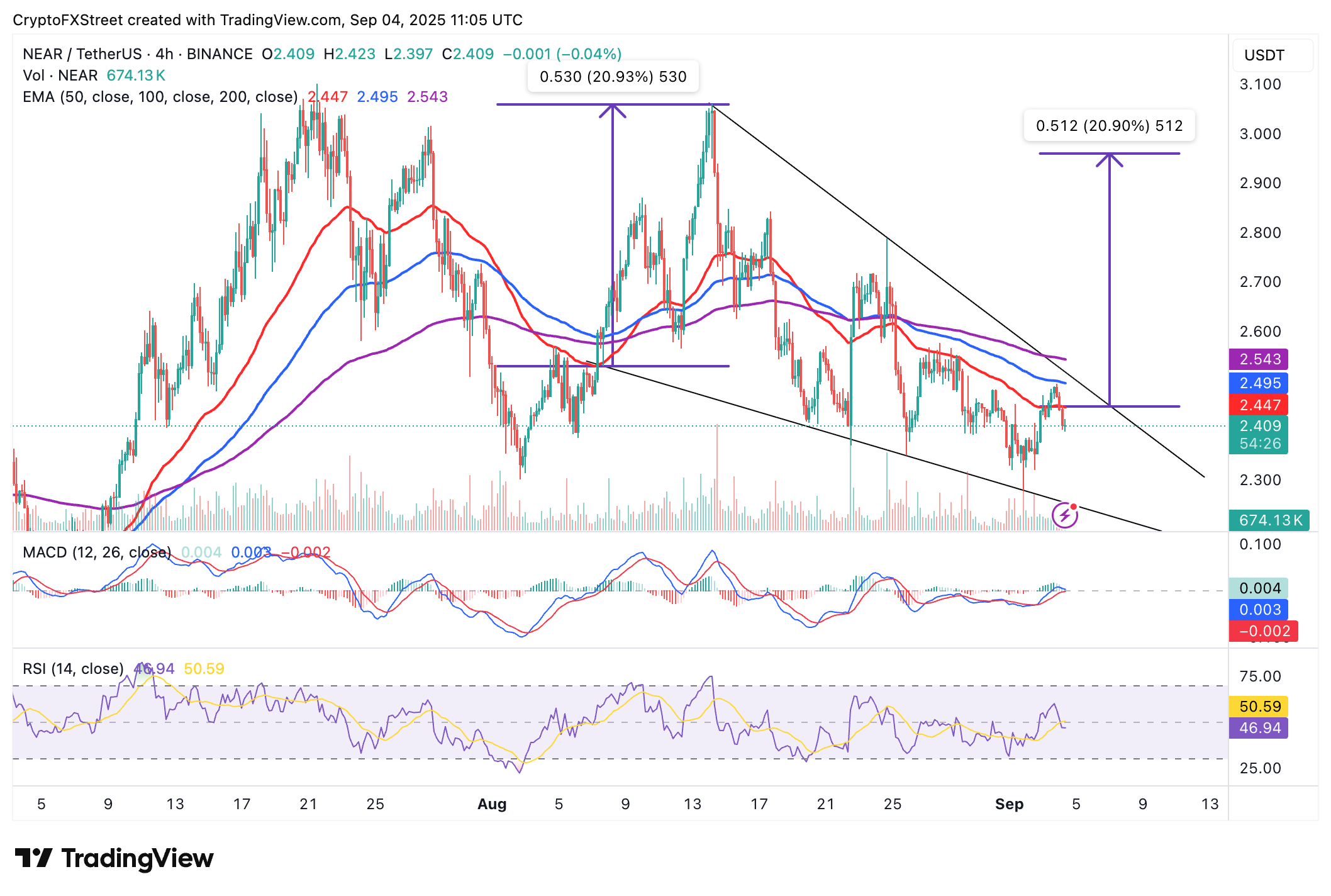 El precio de NEAR se acerca a una ruptura del patrón de cuña descendente en el gráfico de 4 horas. Este es un patrón alcista formado por dos líneas de tendencia convergentes. A medida que el volumen de negociación disminuye, los bajistas gradualmente pierden su control sobre la tendencia, allanando el camino para una ruptura alcista al final del período de consolidación.