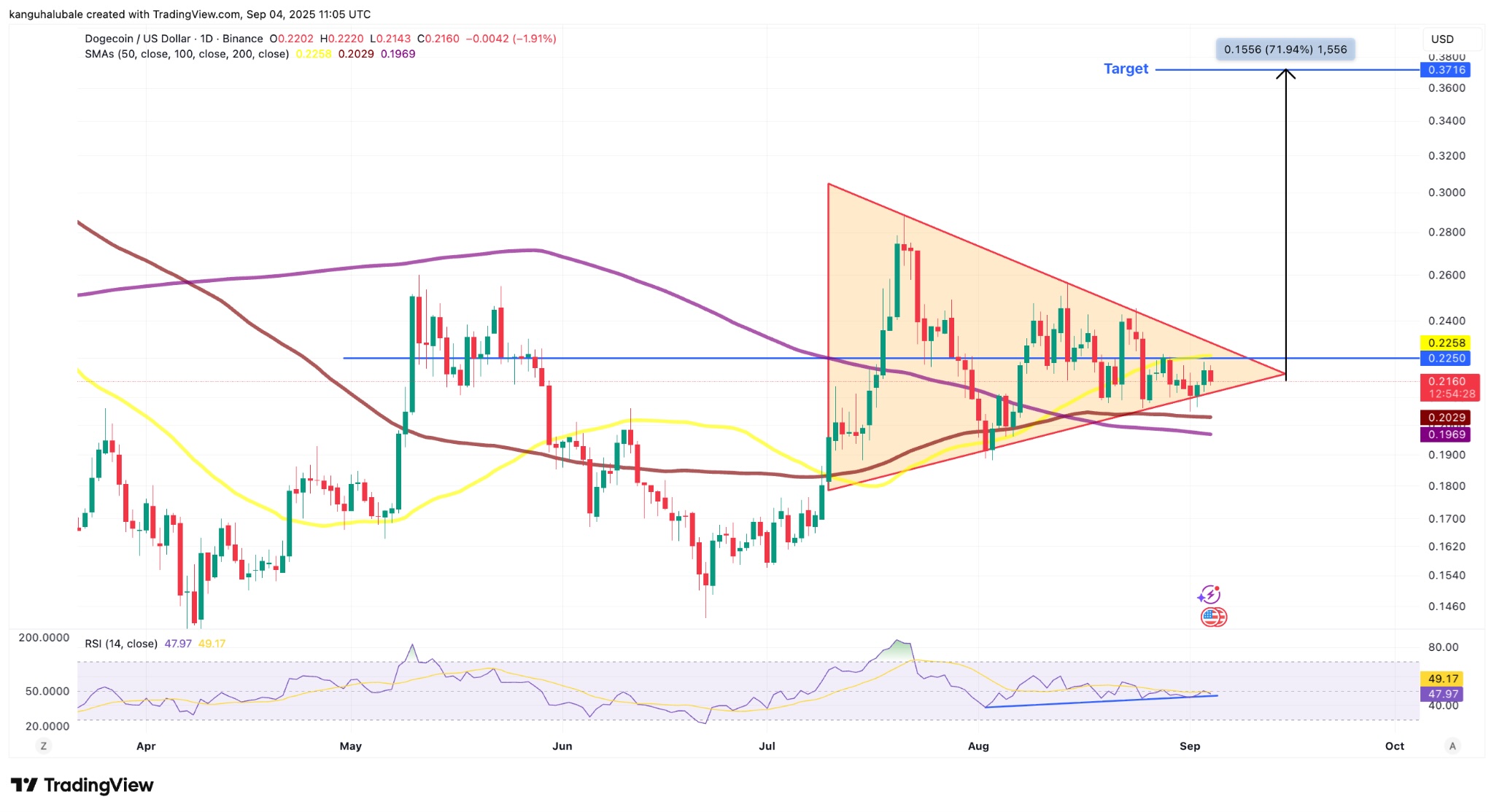 En un marco más corto, el principal memecoin consolida dentro de un triángulo simétrico en el gráfico diario, según datos de Cointelegraph Markets Pro y TradingView.