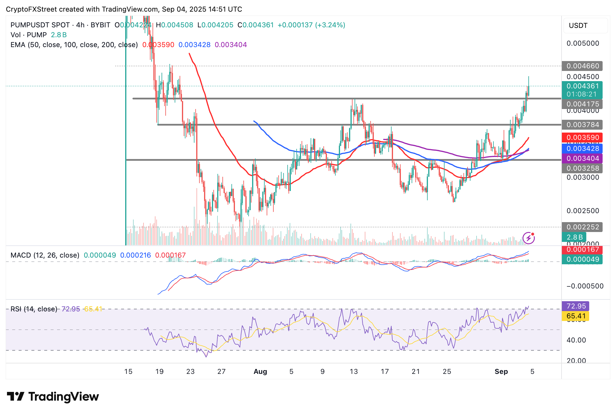 El precio de Pump.fun se cotiza a 0.0043$, subiendo más del 7% en el momento de escribir el jueves. El token, nativo de la plataforma de lanzamiento de monedas meme, exhibe una sólida perspectiva alcista, respaldada por el crecimiento de los ingresos de la plataforma y múltiples señales de compra en el marco de tiempo de 4 horas.
