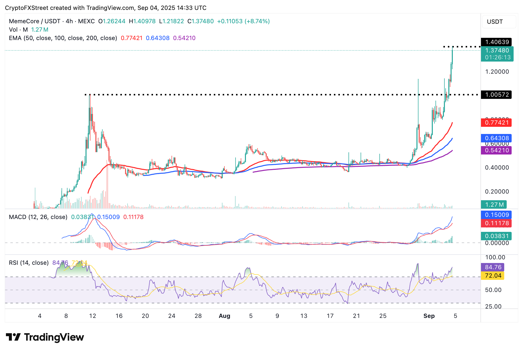 MemeCore se encuentra entre las criptomonedas de mejor rendimiento el jueves, subiendo más del 38% para intercambiarse a 1.37$. El interés en el token comenzó a finales de agosto después de que alcanzara un mínimo local en alrededor de 0.36$.
