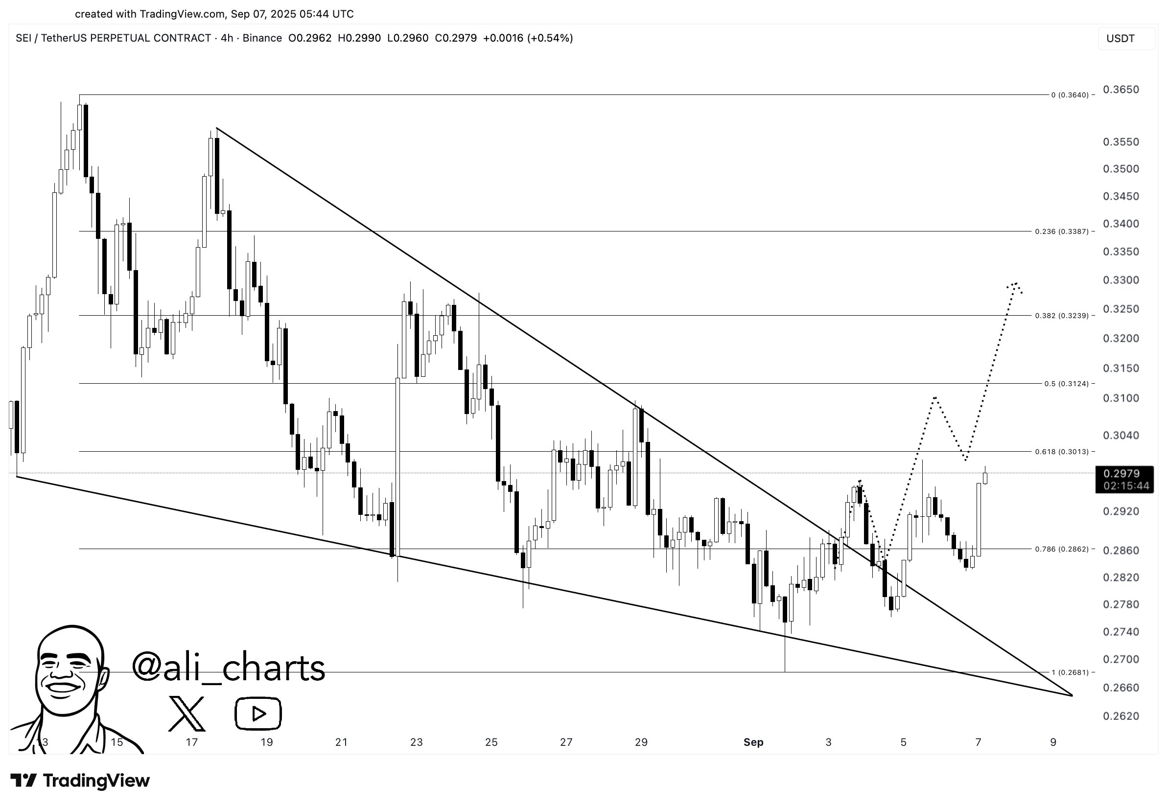 Entre las altcoins en el enfoque de Martinez hoy se encuentra SEI Coin. El analista, señalando un continuo impulso alcista, predice un objetivo de $0.37 en el gráfico compartido. Después de hacer una serie de picos más bajos y romper la resistencia, SEI Coin ahora tiene en la mira las barreras en $0.301 y $0.3124, con el objetivo final fijado en $0.37.