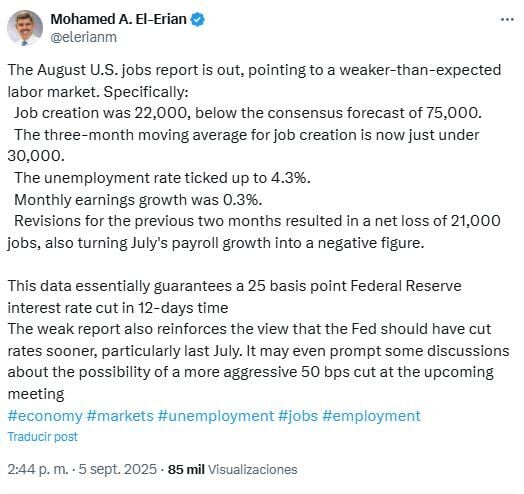 Mohamed El-Erian, un destacado economista, afirmó que los datos apuntaban a un recorte de 25 puntos básicos en la reunión de la FED en menos de dos semanas. Añadió que un recorte de 50 puntos seguía siendo una posibilidad.