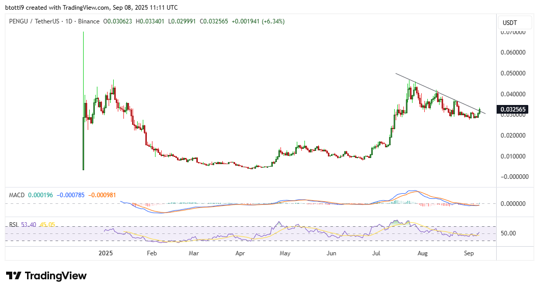 - El precio de PENGU sube a 0.033 dólares en medio de un aumento de volumen del 300%.