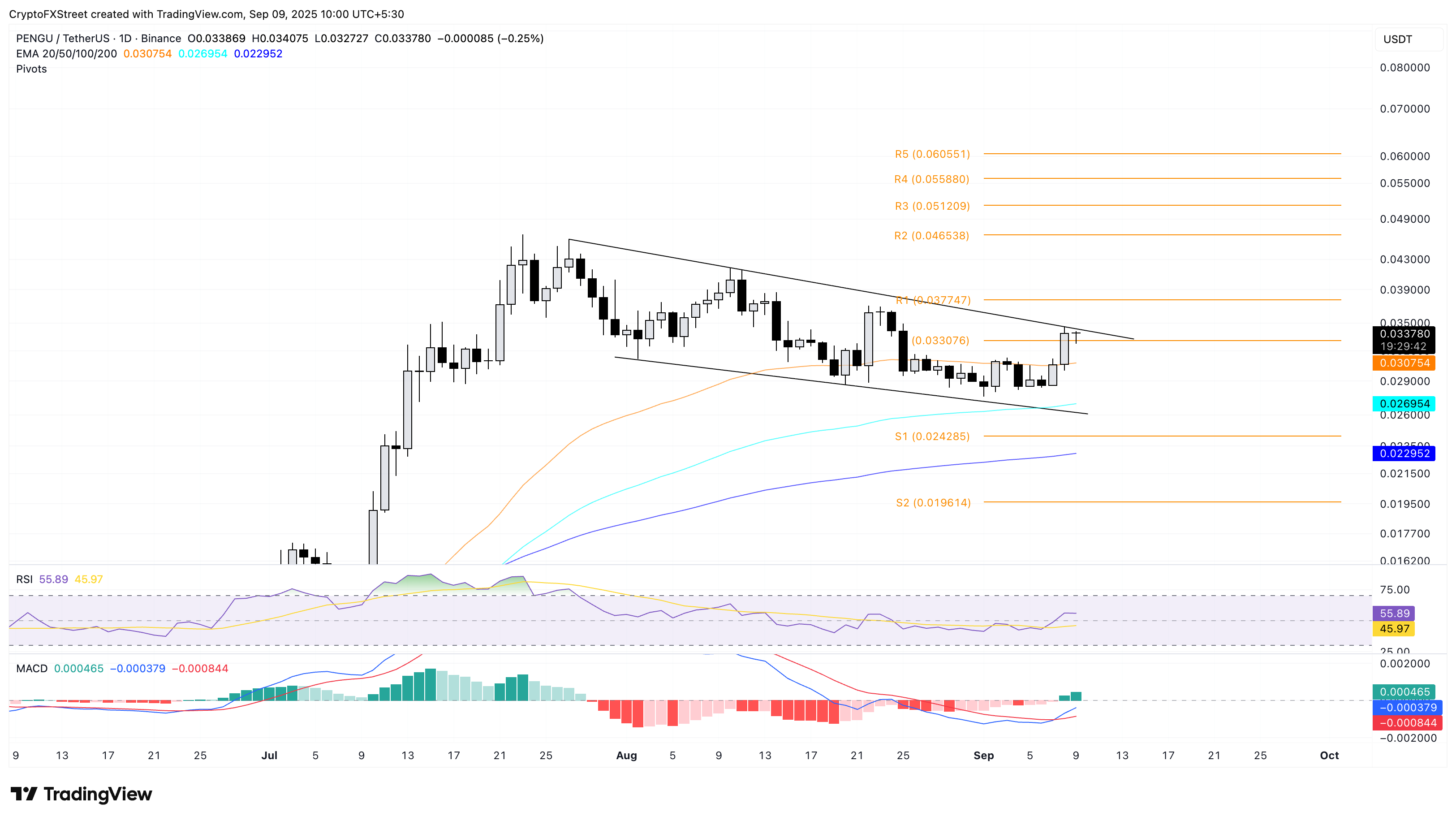 Un cierre decisivo por encima del máximo del lunes en 0.03464$ confirmaría la ruptura del canal, apuntando potencialmente a la resistencia de pivote R1 en 0.03774$.