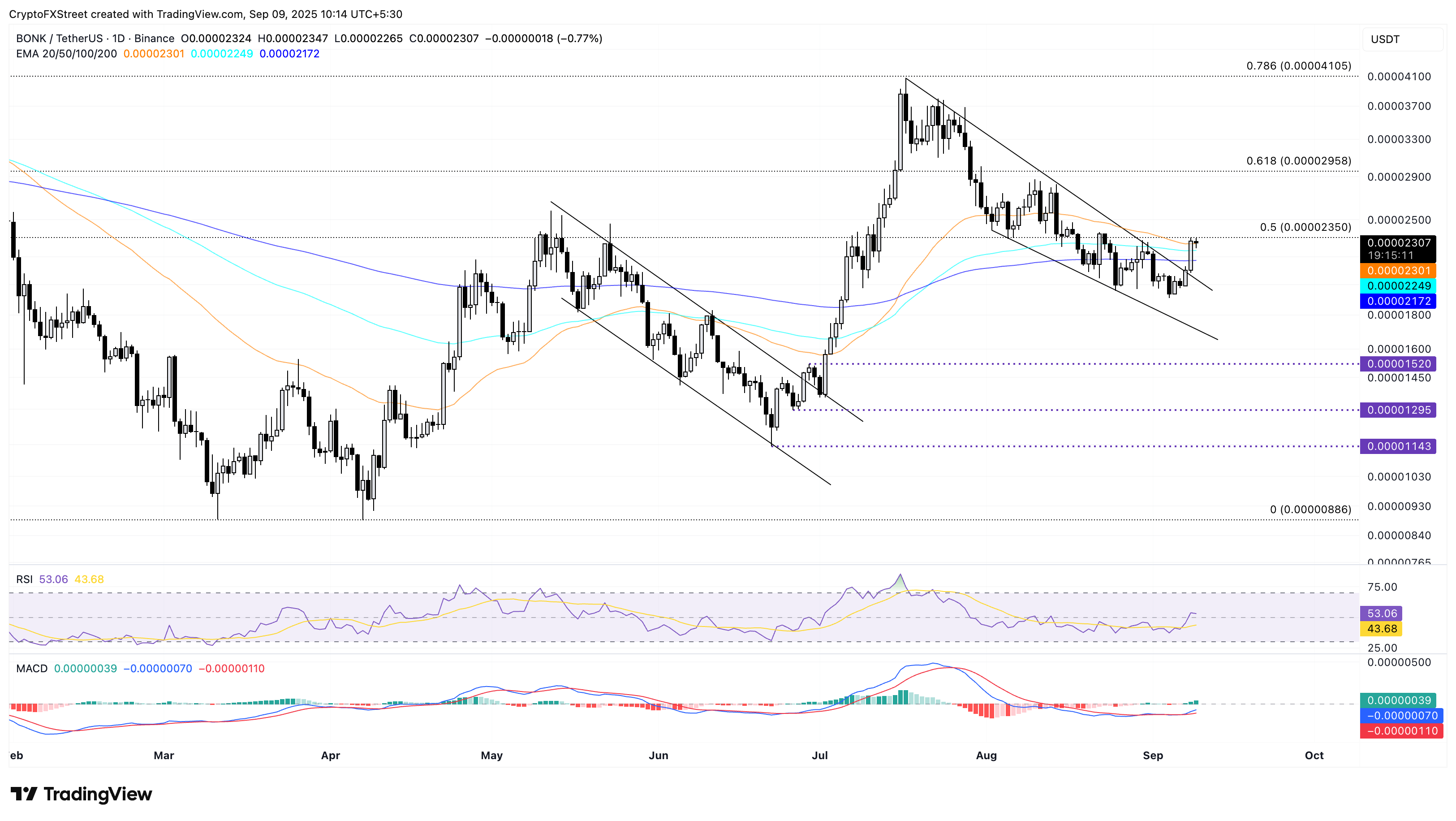 Si BONK revierte desde la resistencia de 0.00002350$, podría volver a probar la EMA de 100 días en 0.00002249$.