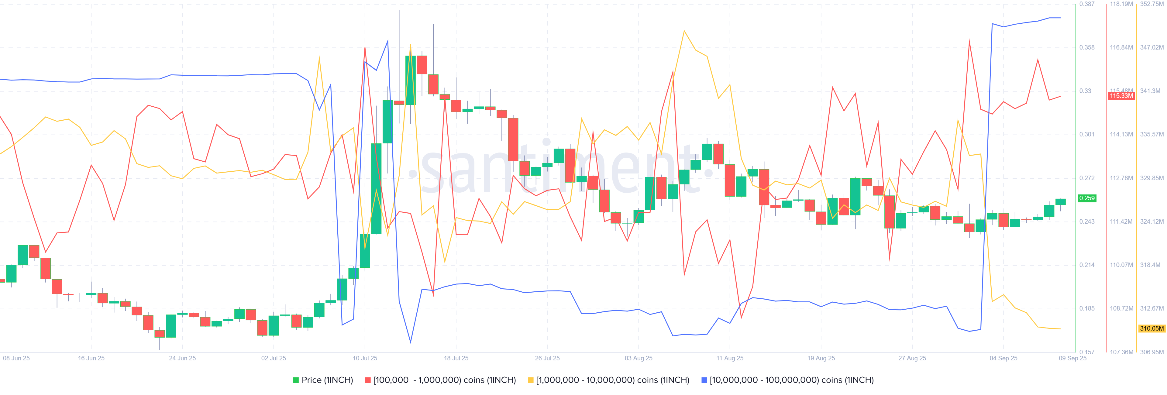Los datos de Distribución de Oferta de Santiment respaldan una perspectiva alcista para 1inch, ya que la mayoría de los grupos que poseen grandes cantidades de tokens continúan aumentando sus tenencias.