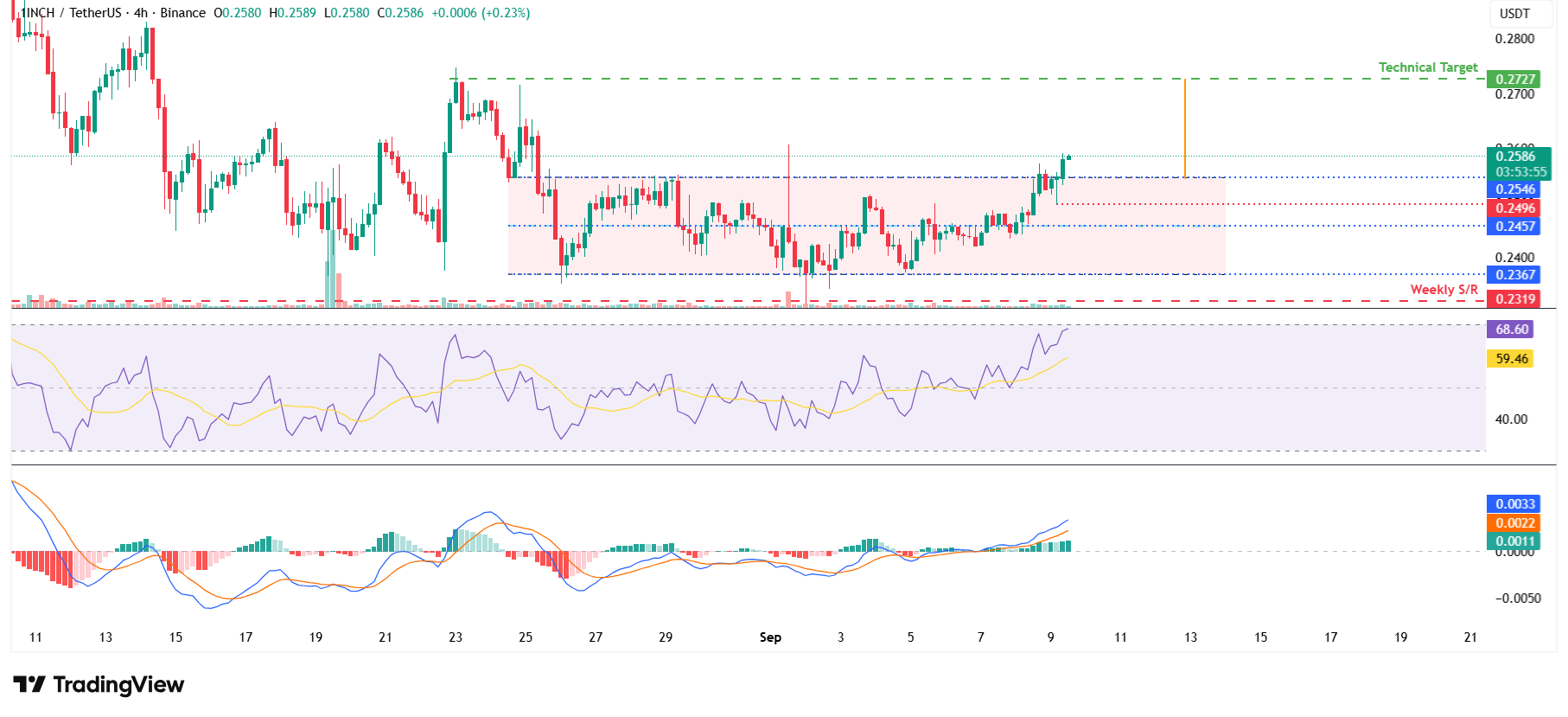 En el gráfico de 4 horas, el precio de 1inch rompió por encima de 0.254$ el martes, lo que se alinea con el límite superior de un canal paralelo. Esta ruptura favorece a los toros, con un objetivo técnico en 0.272$, que se obtiene en base a la altura del canal desde el punto de ruptura.