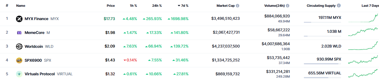 De esta forma, MYX se posiciona como la criptomoneda con mejor rendimiento semanal dentro del top 100 por capitalización de mercado, tal como se observa a continuación: