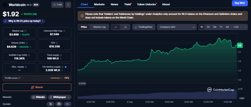 WLD cotizó en verde hoy después de ganar más del 50%.