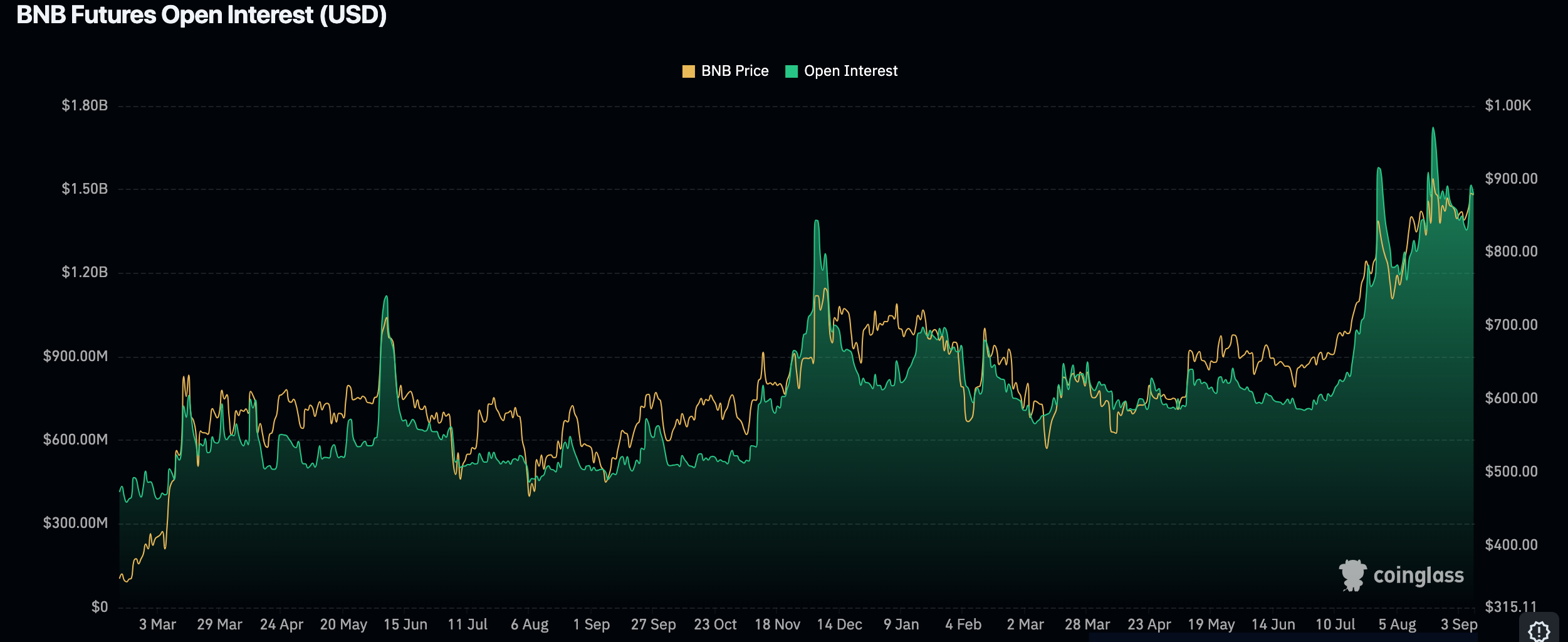 El interés abierto en futuros de BNB alcanzó $1,49 mil millones, uno de los niveles más altos registrados. Esto refleja un fuerte aumento de posiciones apalancadas, tanto largas como cortas.