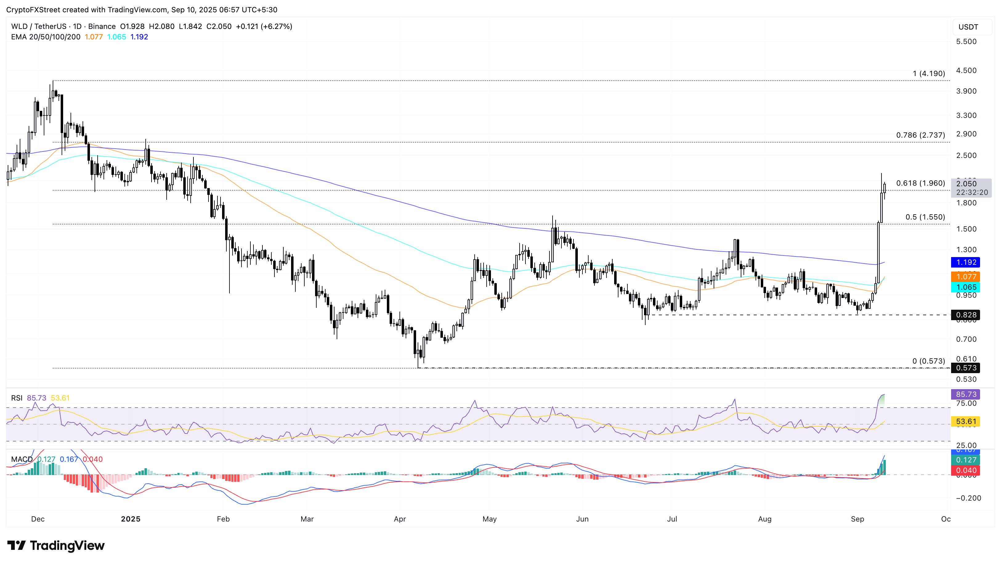 Worldcoin se negocia por encima de la marca de 2$ al momento de la publicación el miércoles, extendiéndose un 6% en el día. El token de identidad ha mantenido su tendencia alcista durante los últimos seis días, acumulando un aumento del 93% esta semana hasta ahora, impulsado principalmente por el anuncio de los 270 millones de dólares en tesorería WLD de Eightco.