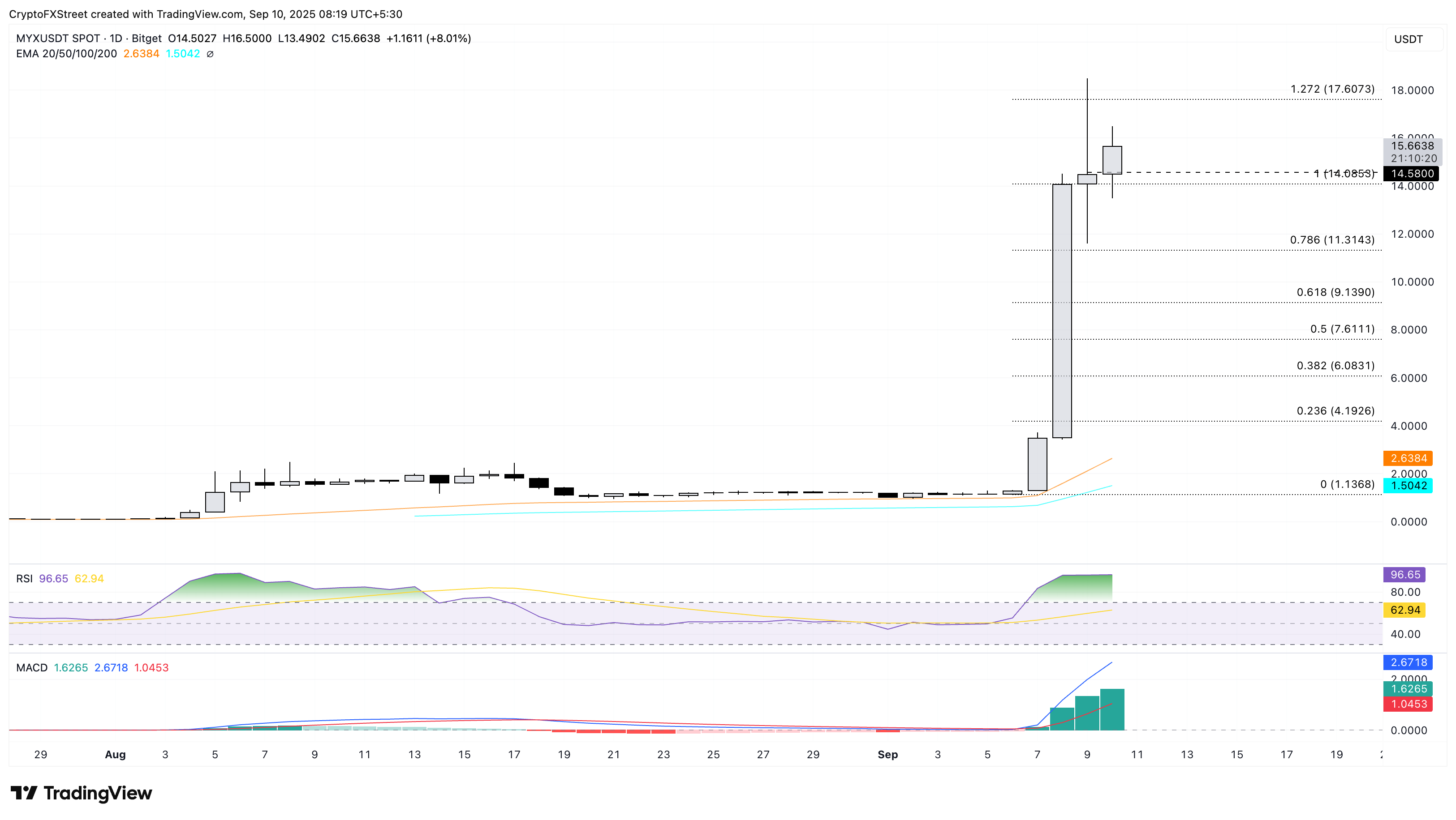 MYX Finance sube un 8% al momento de la publicación el miércoles, acumulando las ganancias del 2% del día anterior. La tendencia alcista en MYX representa más del 340% de ganancias hasta ahora esta semana, con un máximo histórico de 18.50$ el martes.