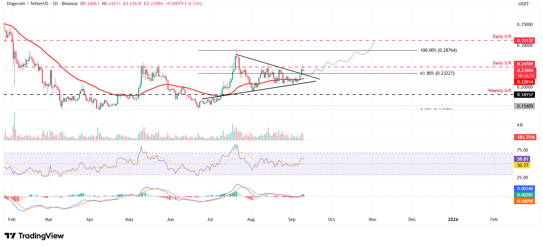 El precio de Dogecoin rompió por encima del patrón de triángulo simétrico el lunes (formado al conectar múltiples máximos y mínimos con dos líneas de tendencia desde mediados de julio), favoreciendo un movimiento alcista por delante. Sin embargo, el martes, DOGE enfrentó un rechazo del nivel de resistencia diario en 0.247$, y a partir del miércoles, se encuentra alrededor de 0.240$.