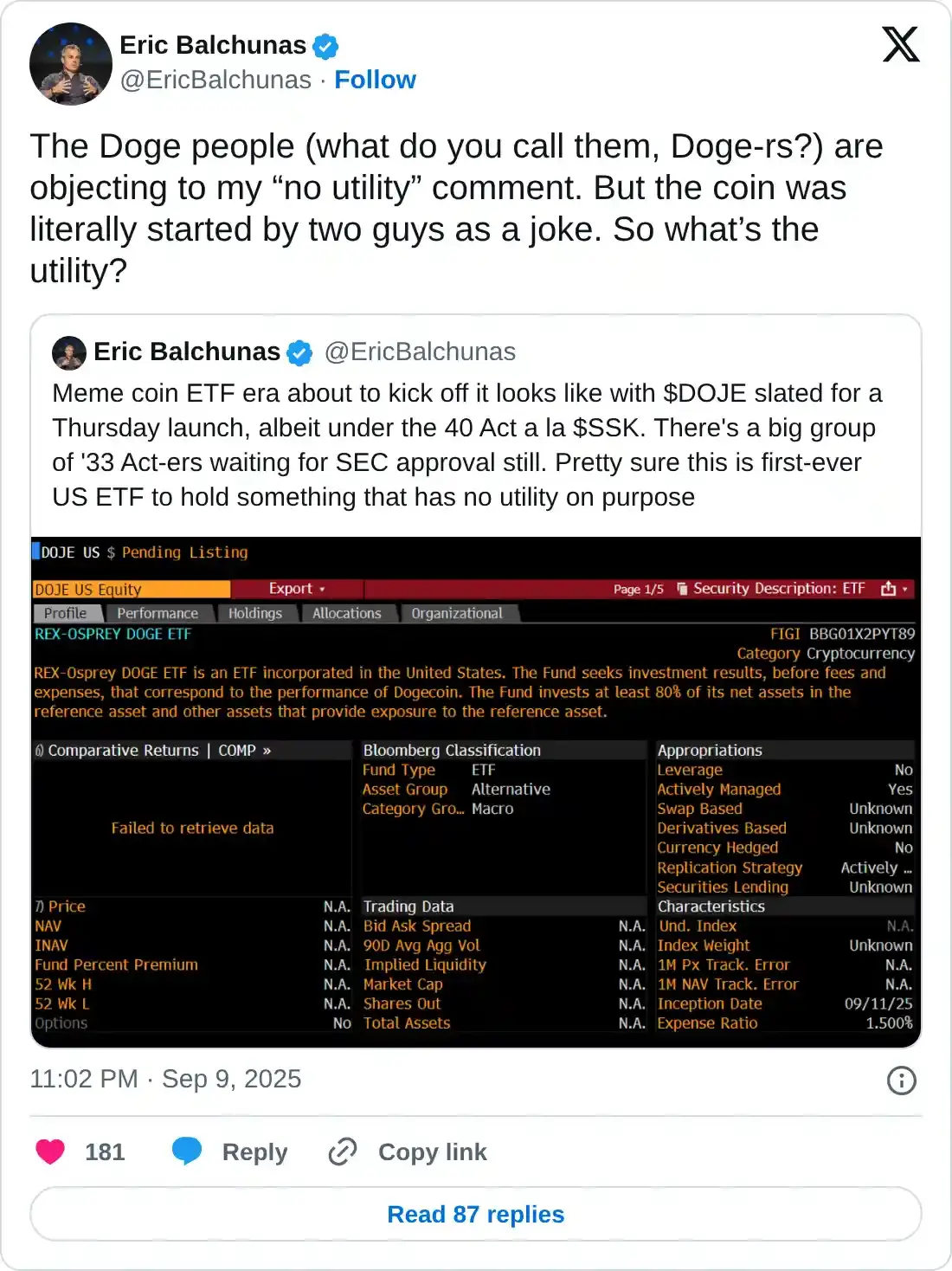 Eric Balchunas, analista senior de ETF en Bloomberg, publicó en su red social X que la "era del ETF de monedas meme está a punto de comenzar," con el ETF de Dogecoin de Rex-Osprey (REX Shares y Osprey Funds) con ticker DOJE que se espera que se lance el jueves.