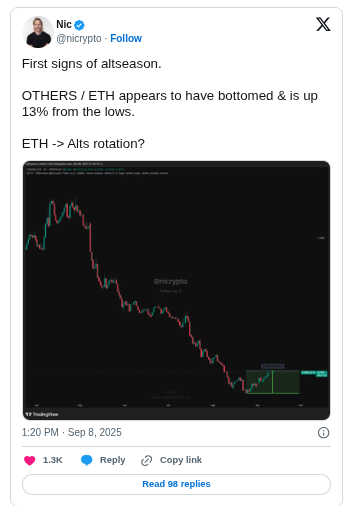 “La consolidación desde mediados de agosto ahora parece lista para resolverse al alza. El RSI no está sobrecalentado, y el momento se alinea perfectamente con una rotación de BTC → ETH → altcoins”, comentó Davis aquí.