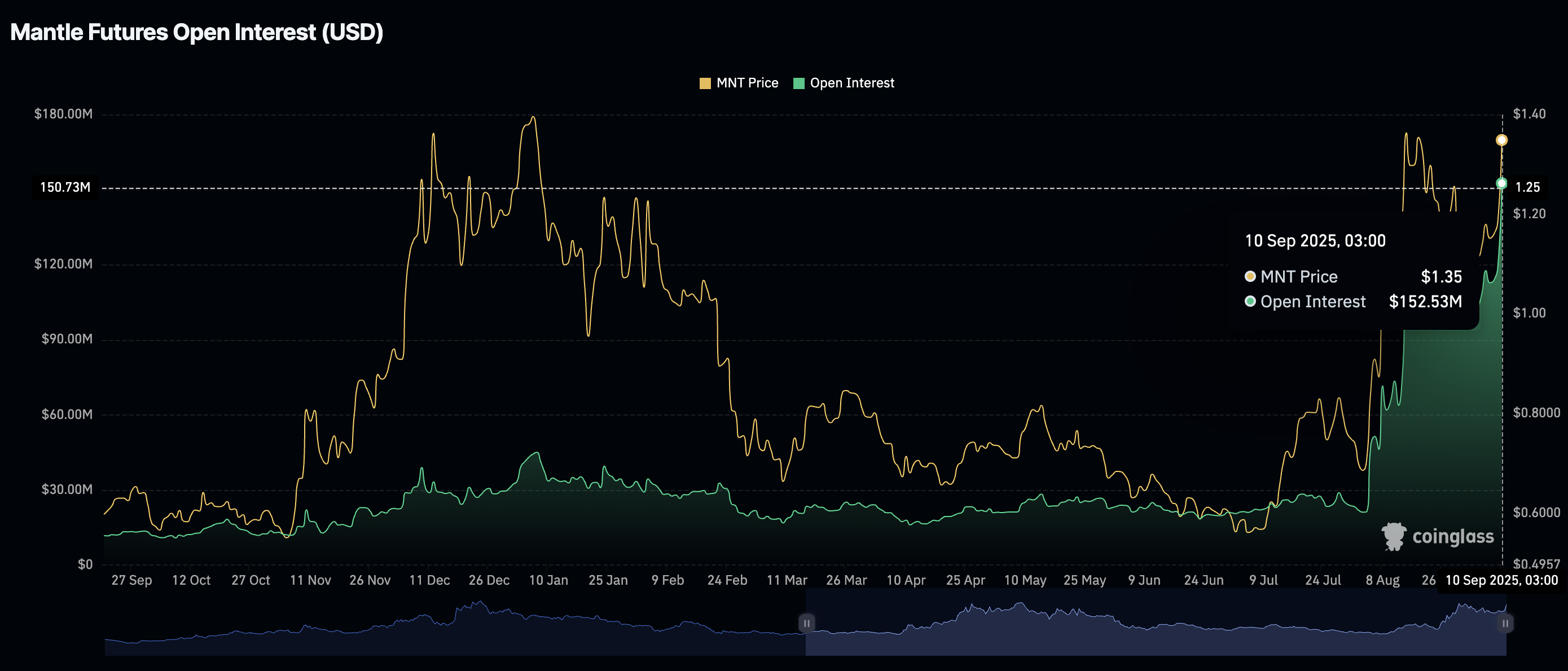 El interés minorista en Mantle ha aumentado significativamente en los últimos días, subrayando el incremento en el Interés Abierto (OI) de futuros a 153 millones de dólares desde aproximadamente 99 millones el 3 de septiembre y 21 millones el 4 de agosto.