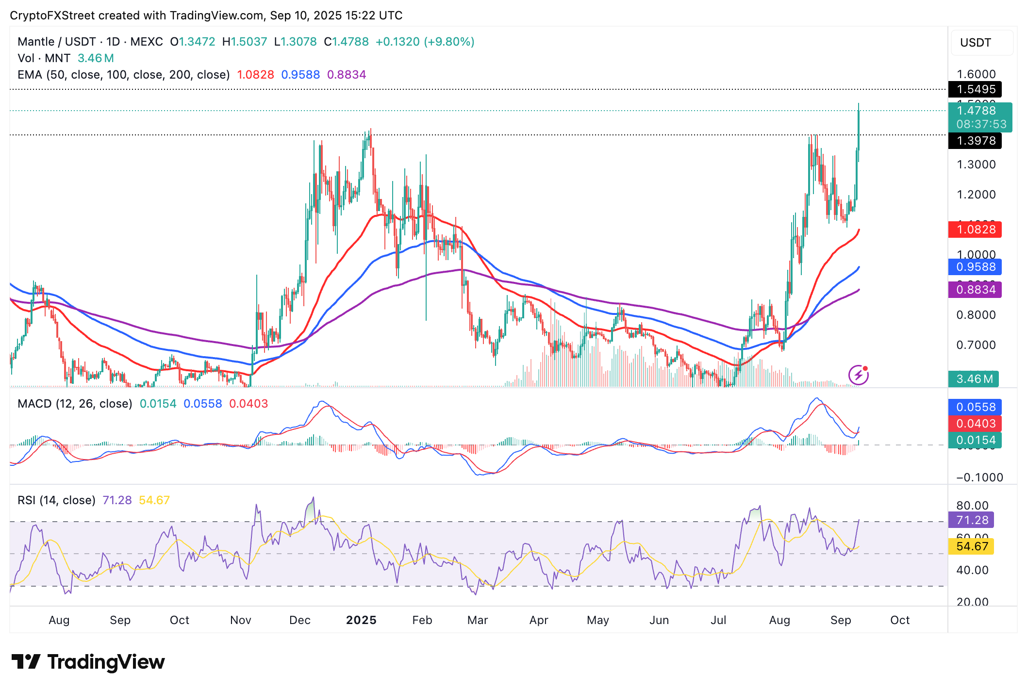 Mantle se mantiene significativamente por encima de la media móvil exponencial (EMA) de 50 días en 1.08$, la EMA de 100 días en 0.95$ y la EMA de 200 días en 0.88$, respaldando el sentimiento positivo en el ecosistema.