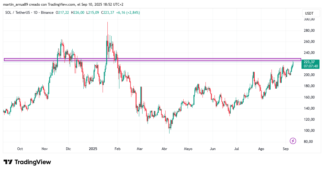 Solana (SOL) superó los 220 dólares y actualmente enfrenta una zona de resistencia en niveles que ha tenido dificultades para superar en ciclos anteriores.