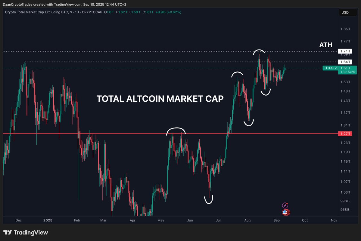 A medida que se desarrolla el nuevo día, Bitcoin (BTC) se acerca a un momento crucial, cerrando diariamente por encima de $113,000 y señalando el fin de su comportamiento monótono. Los datos cruciales del Índice de Precios al Consumidor (IPC) de EE. UU. se esperan pronto; si están alineados con el Índice de Precios al Productor (IPP), podrían actuar como un factor motivacional significativo. A pesar de esto, el valor de mercado total de altcoins enfrenta la barrera de 2021, que debe ser superada. El analista DaanCrypto destaca este importante obstáculo. Ahora examinaremos la capitalización del mercado de altcoins, el estado de W Coin y el par ETHBTC.