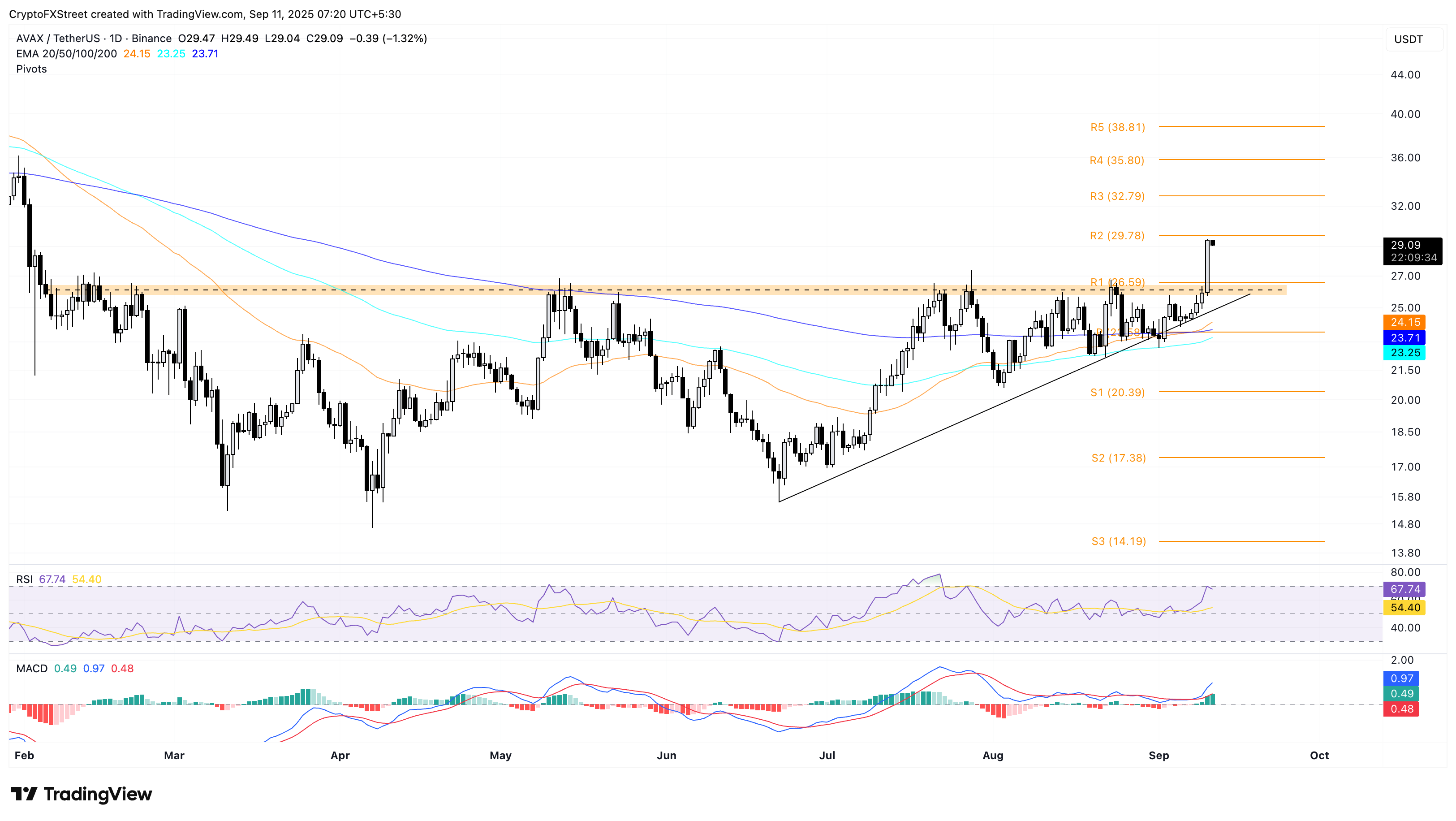 Avalanche se encuentra entre los mejores desempeños, respaldado por el reciente Memorando de Entendimiento firmado entre Ava Labs y WeBlock para impulsar la tokenización y las Stablecoins en Corea del Sur. AVAX baja un 1% en el momento de escribir el jueves, tras el salto del 13% del miércoles, y está a la espera de romper cuatro días consecutivos de tendencia alcista.
