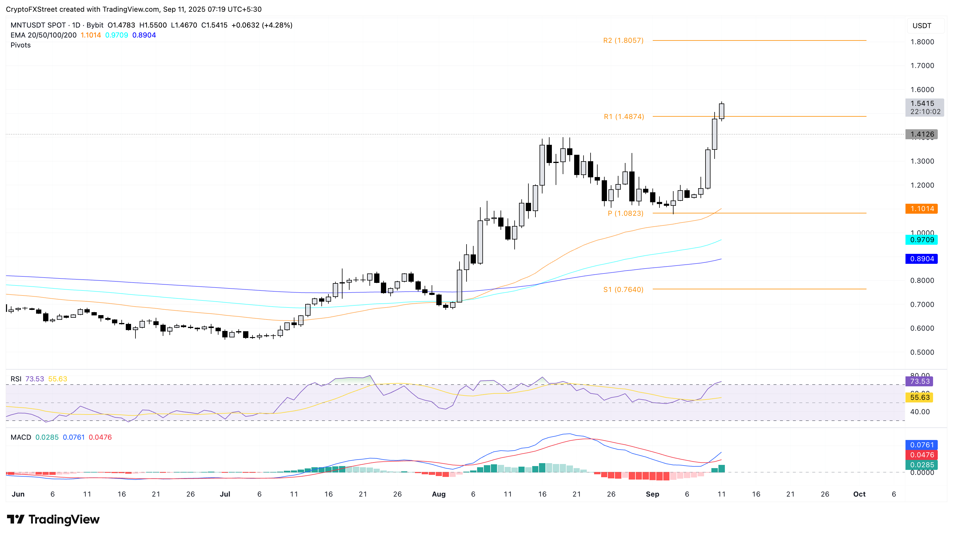 Mantle extiende la tendencia alcista por cuarto día consecutivo, respaldado por los 21 nuevos pares de negociación en Bybit. En el momento de escribir, el token MNT aprecia un 4% el jueves, sumando al aumento del 9% del miércoles.