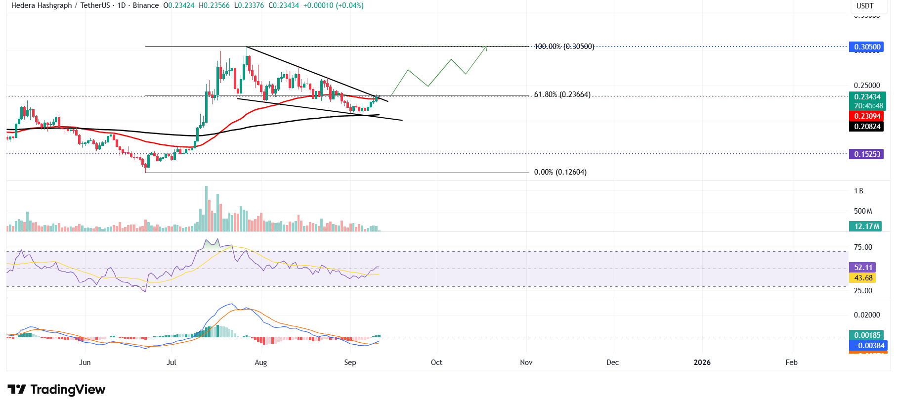 El precio de Hedera rompió por encima del patrón de cuña descendente (dibujado al conectar múltiples máximos y mínimos con dos líneas de tendencia desde finales de julio) el miércoles. Una ruptura de este patrón favorece a los alcistas, y en el momento de escribir el jueves, se sitúa alrededor de 0.234$.