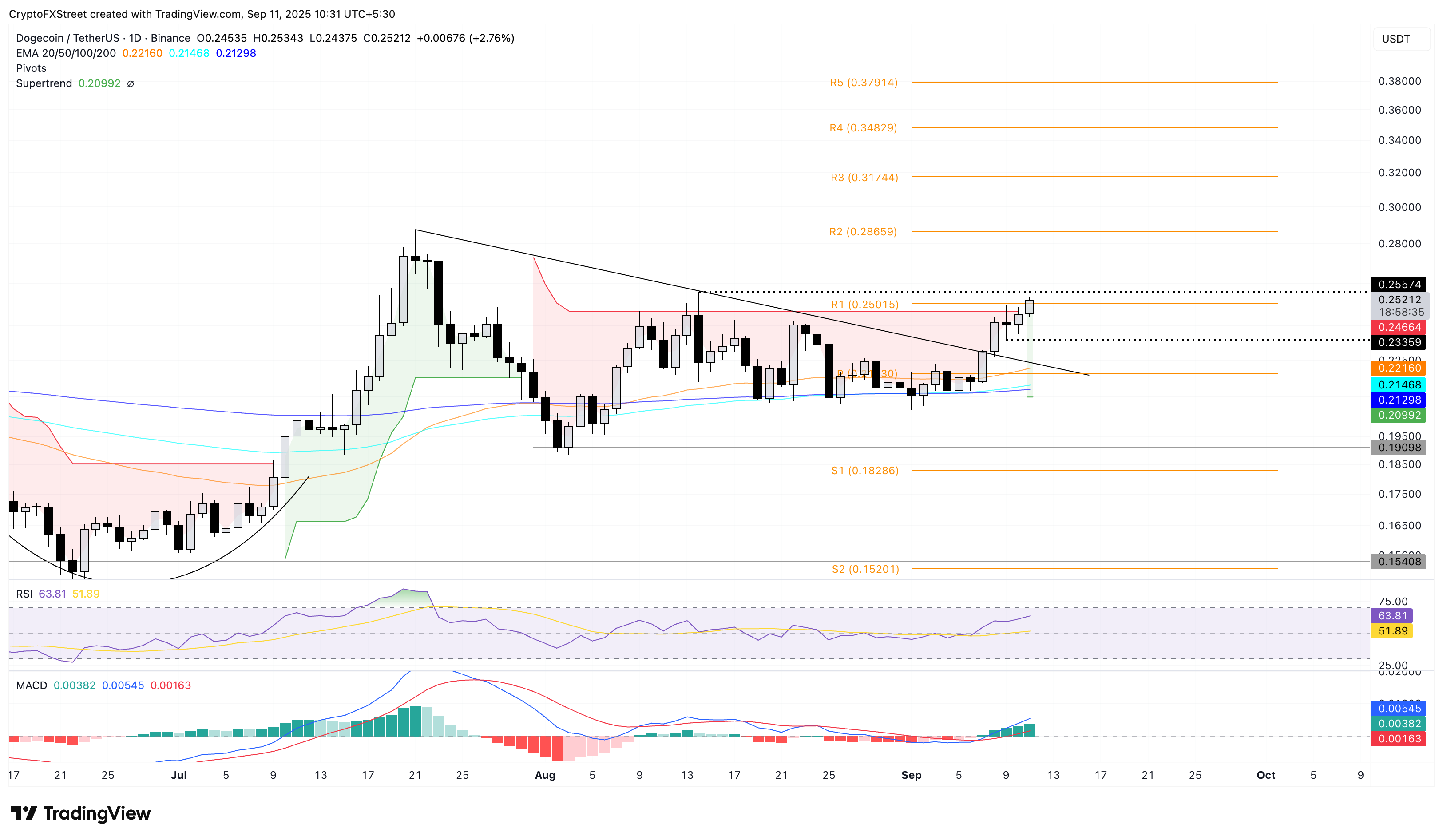 Dogecoin extiende el rally de ruptura de la línea de tendencia por encima de 0.25000$ en el gráfico diario, apuntando a la resistencia de 0.25574$ marcada por el pico del 14 de agosto. Un empuje limpio por encima de este nivel podría extender el rally hasta el nivel pivote R2 en 0.28659$.