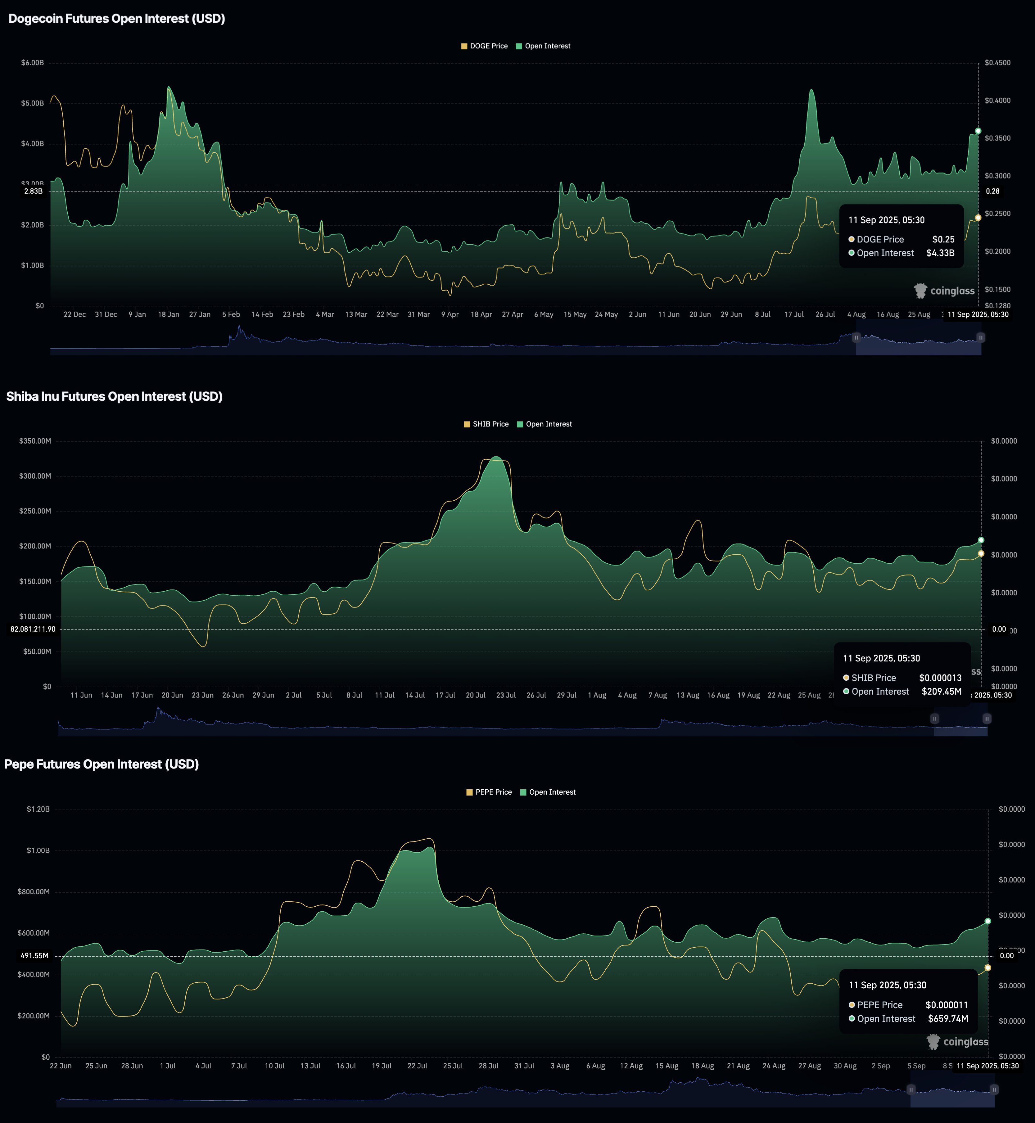Los datos de CoinGlass muestran un aumento significativo en el Interés Abierto (OI) de monedas meme como Dogecoin, Shiba Inu y Pepe. El OI de DOGE ha aumentado a 4.33 mil millones de dólares, desde 3.31 mil millones de dólares el domingo, mientras que el OI de SHIB registra un aumento a 209.45 millones de dólares, desde 173.75 millones de dólares el domingo.