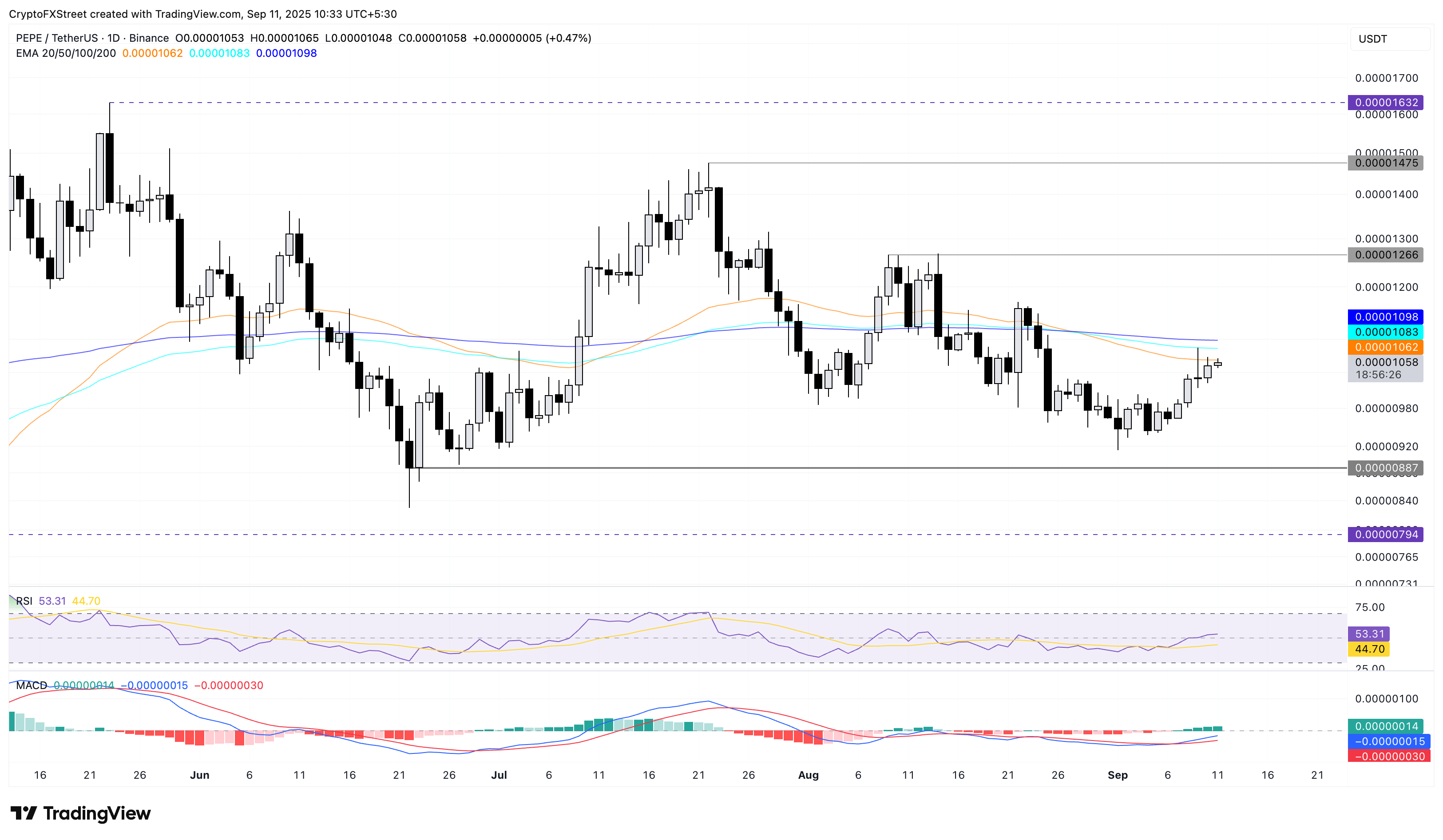 Si PEPE supera la EMA de 200 días en 0.00001098$, podría extender la recuperación hasta el nivel de 0.00001266$, último nivel probado el 14 de agosto.