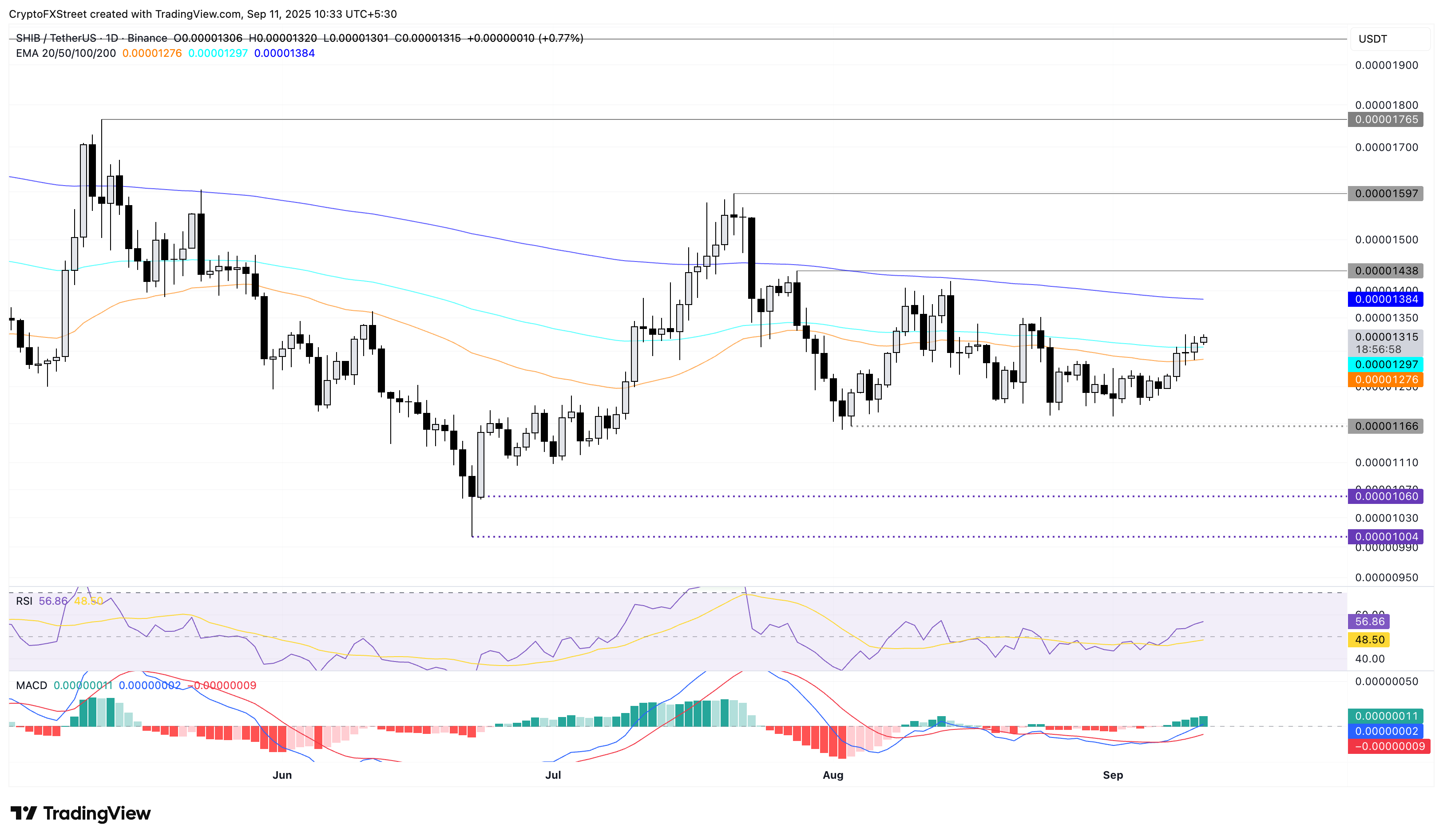 Mirando hacia abajo, si SHIB pierde la EMA de 50 días en 0.00001276$, podría revertir la tendencia hacia el nivel de soporte de 0.00001166$.