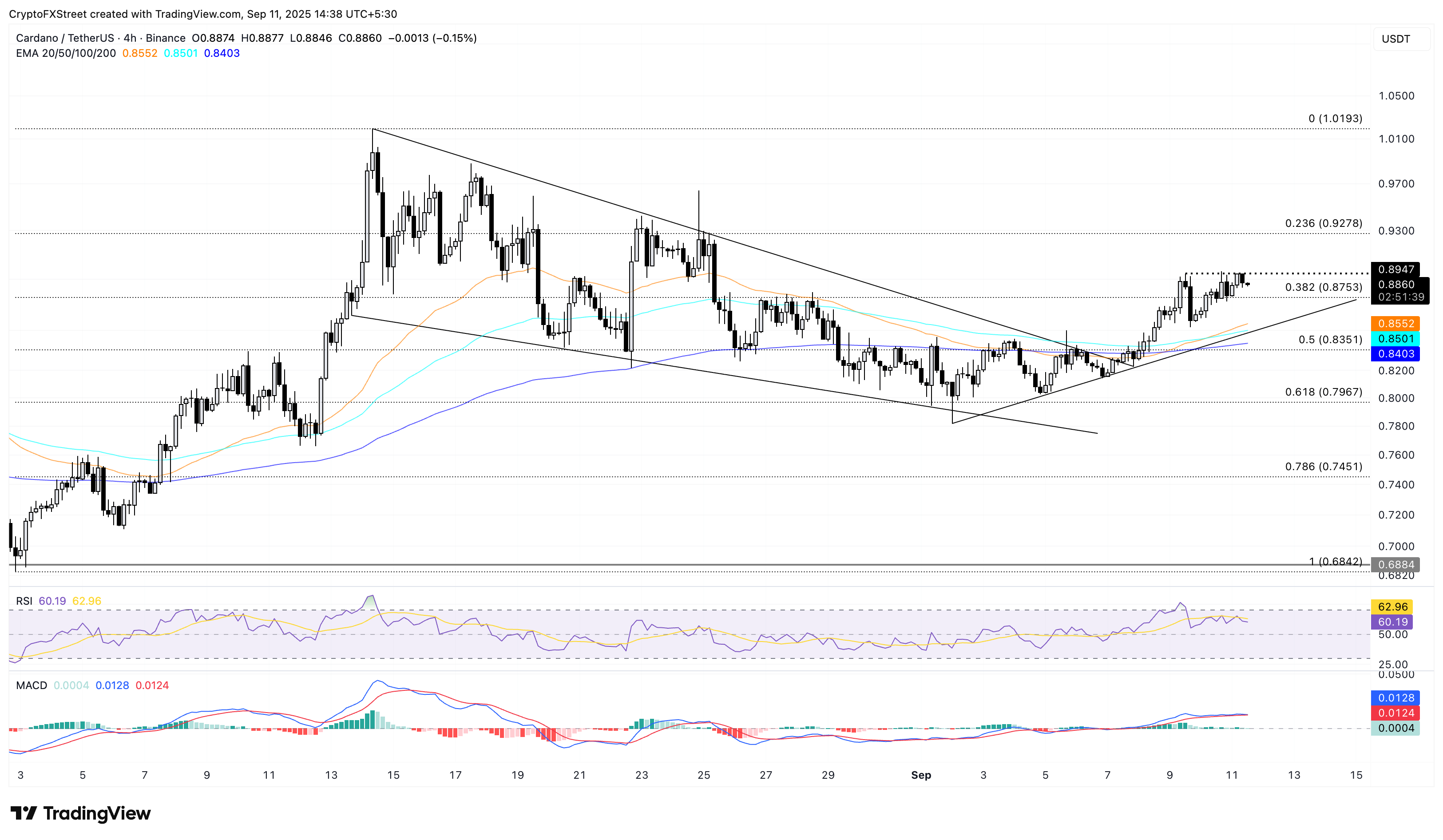 Cardano se recupera con un rally de ruptura de cuña descendente en el gráfico de 4 horas, luchando por superar el nivel de 0.8947$. En el momento de la redacción, $ADA se detiene por debajo de esta resistencia clave, con el nivel de Fibonacci del 38.2% en 0.8753$ actuando como el nivel de soporte inmediato, derivado del retroceso entre el mínimo del 2 de agosto en 0.6842$ y el máximo del 14 de agosto en 1.0193$.