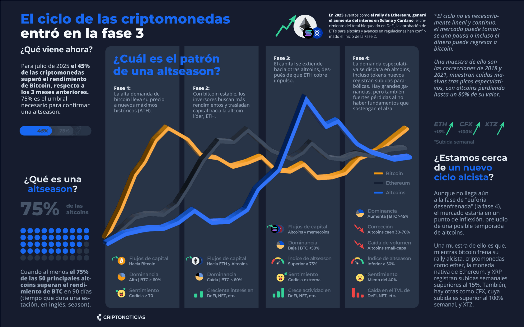 - Fase 3: se activa cuando ETH toma impulso y el capital fluye hacia otras criptomonedas de gran capitalización, reflejando el entusiasmo creciente dentro del mercado.