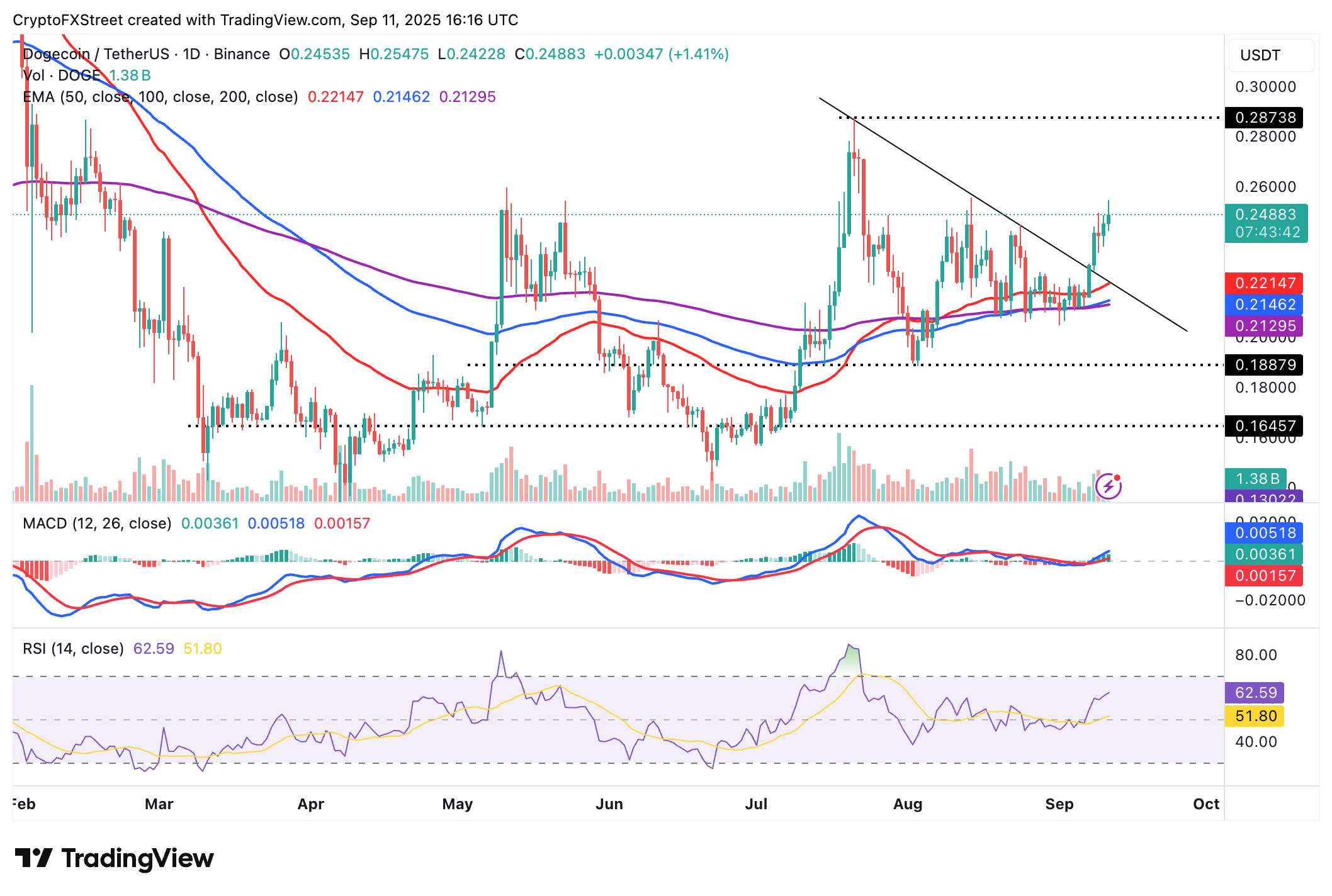 Una ruptura por encima del obstáculo a corto plazo de 0.25$ podría validar la perspectiva alcista de la moneda meme antes del lanzamiento del Fondo Cotizado en Bolsa (ETF) de Dogecoin por Rex-Osprey (REX Shares y Osprey Funds).
