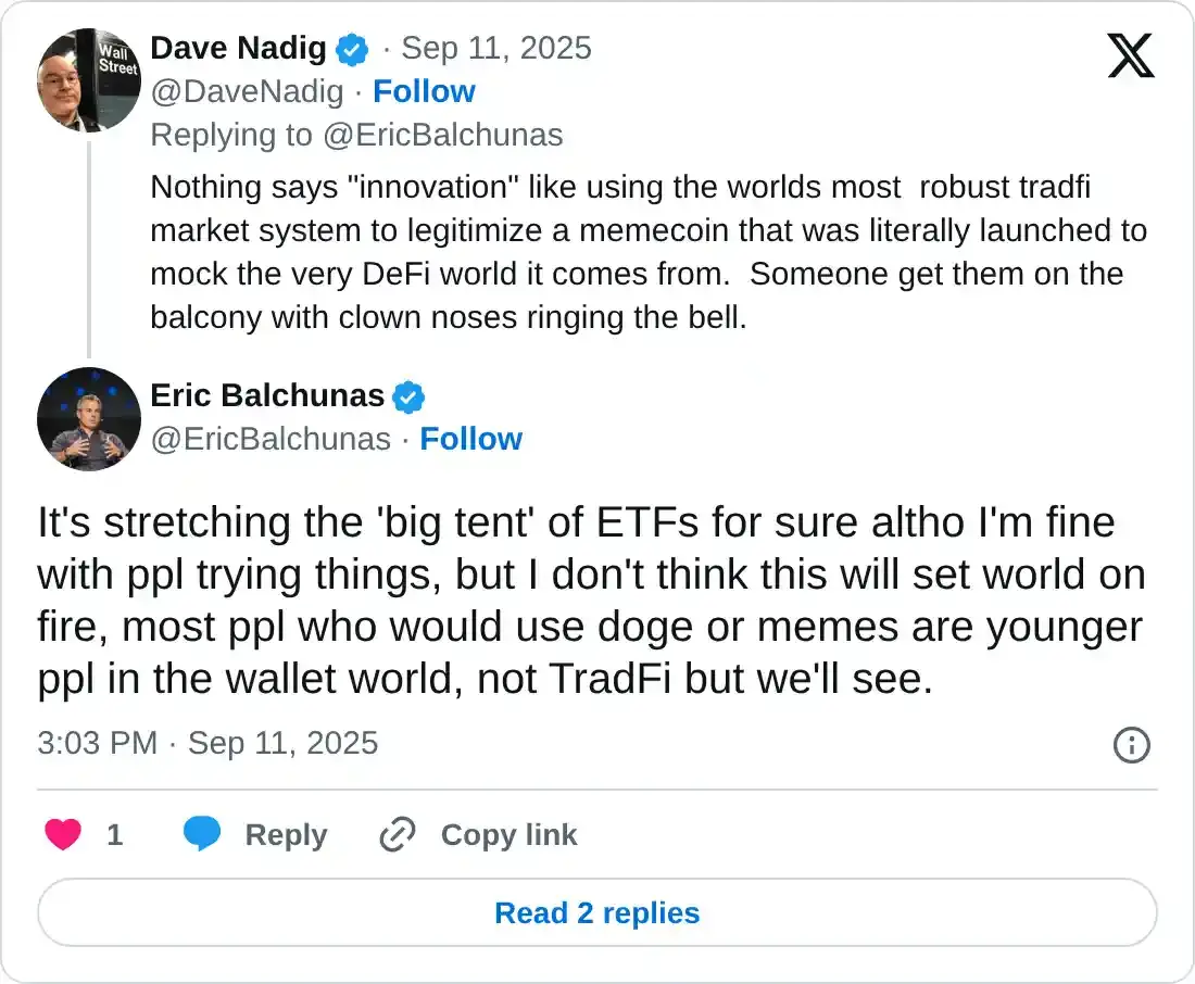 Balchunas agregó que el ETF DOJE podría implicar "ampliar el 'gran toldo' de los ETF", citando que es probable que menos personas prefieran la exposición a las monedas meme. El analista argumentó que "la mayoría de las personas que usarían DOGE o memes son personas más jóvenes en el mundo de las billeteras, no en TradFi".